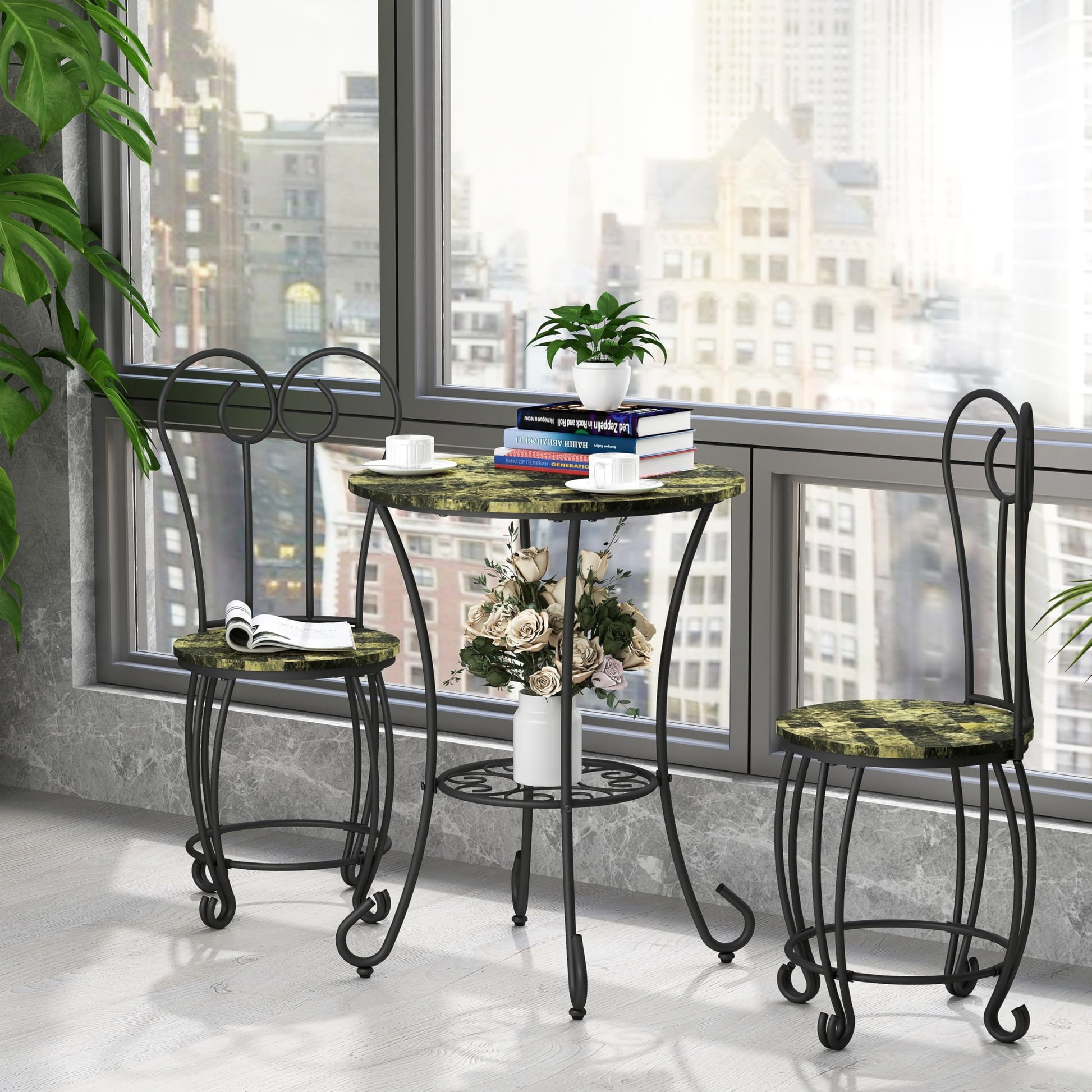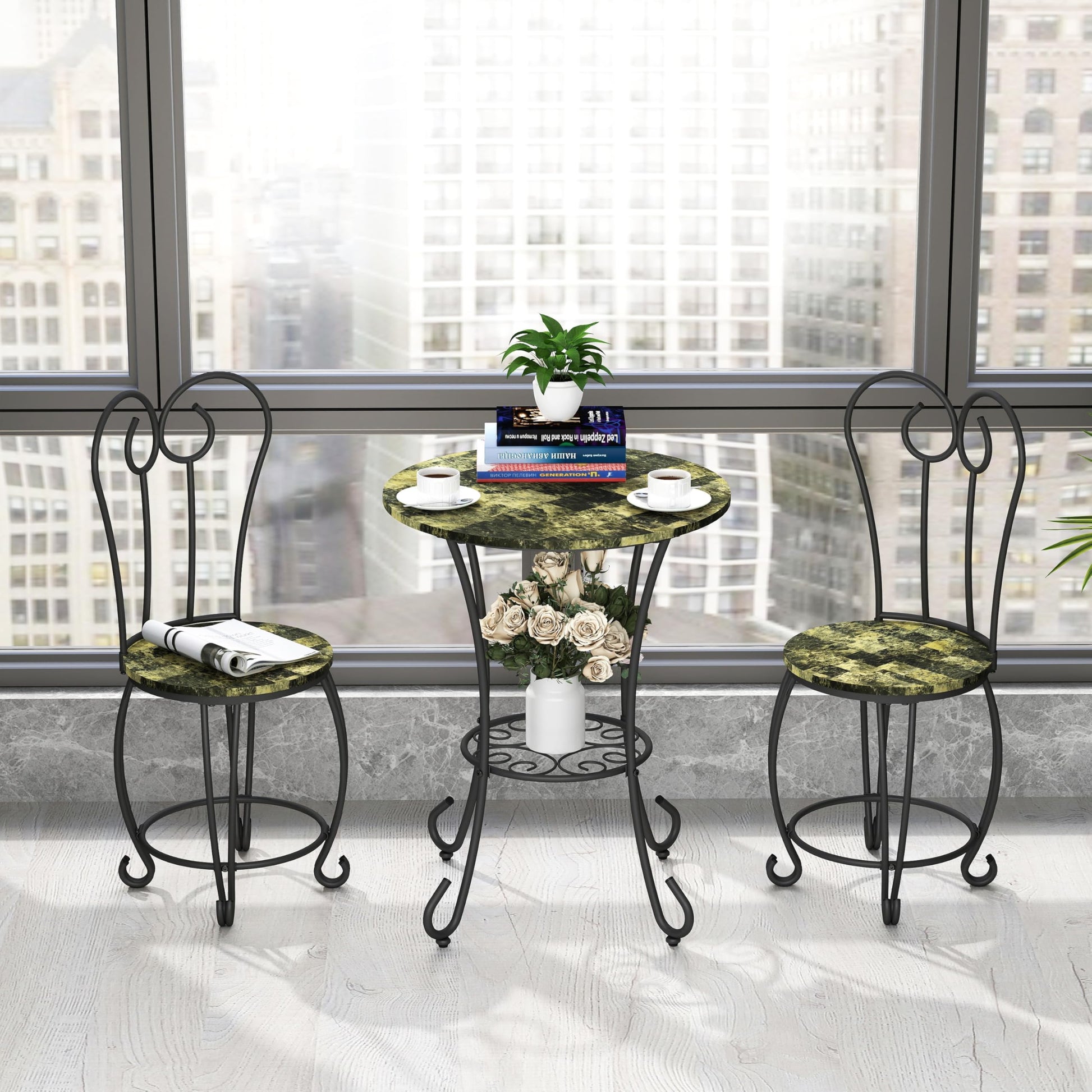 - This 3-piece bistro set features a beautifully curved wrought iron frame with S-shaped accents, bringing a classic American charm to your home. Perfect for apartments, dining rooms, and coffee corners.