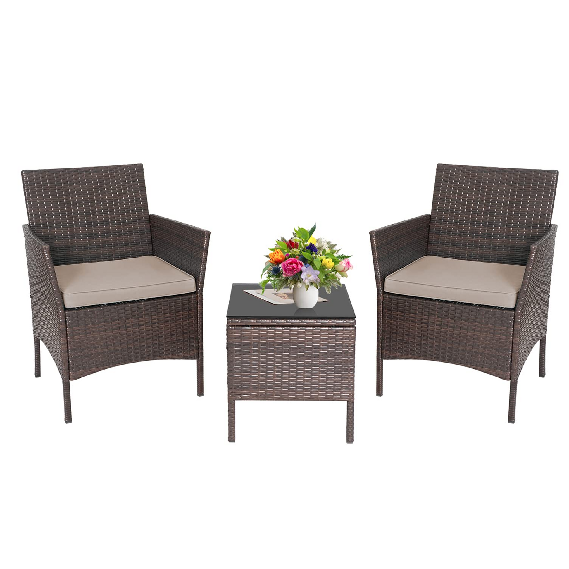 - this terrace furniture is made of strong steel and high-quality rattan. The patio kit is durable and can be used for a long time. The soft sponge filled seat gives you extra comfort, and the cover can be removed for easy cleaning and maintenance. Toughened glass is strong and light, and can be scrubbed or washed with water.