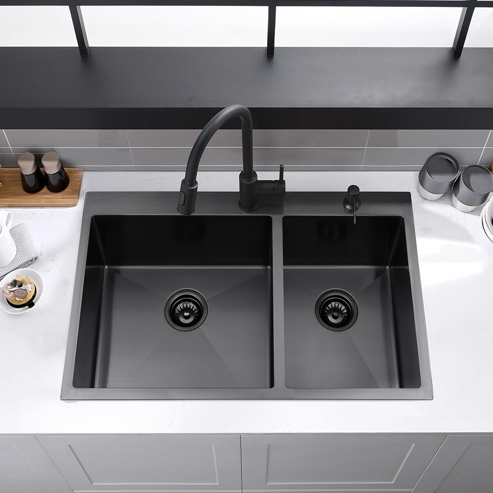 - Indestructible Construction: The double sink is constructed of dent-resistant 16-gauge stainless steel for superior strength and durability. The gunmetal black finish is applied the innovative NANO-PVD technique, which works like water on lotus leaf- no water trace left, very easy to clean, anti-freezing heat and non-seepage water, long lasting and durability.
