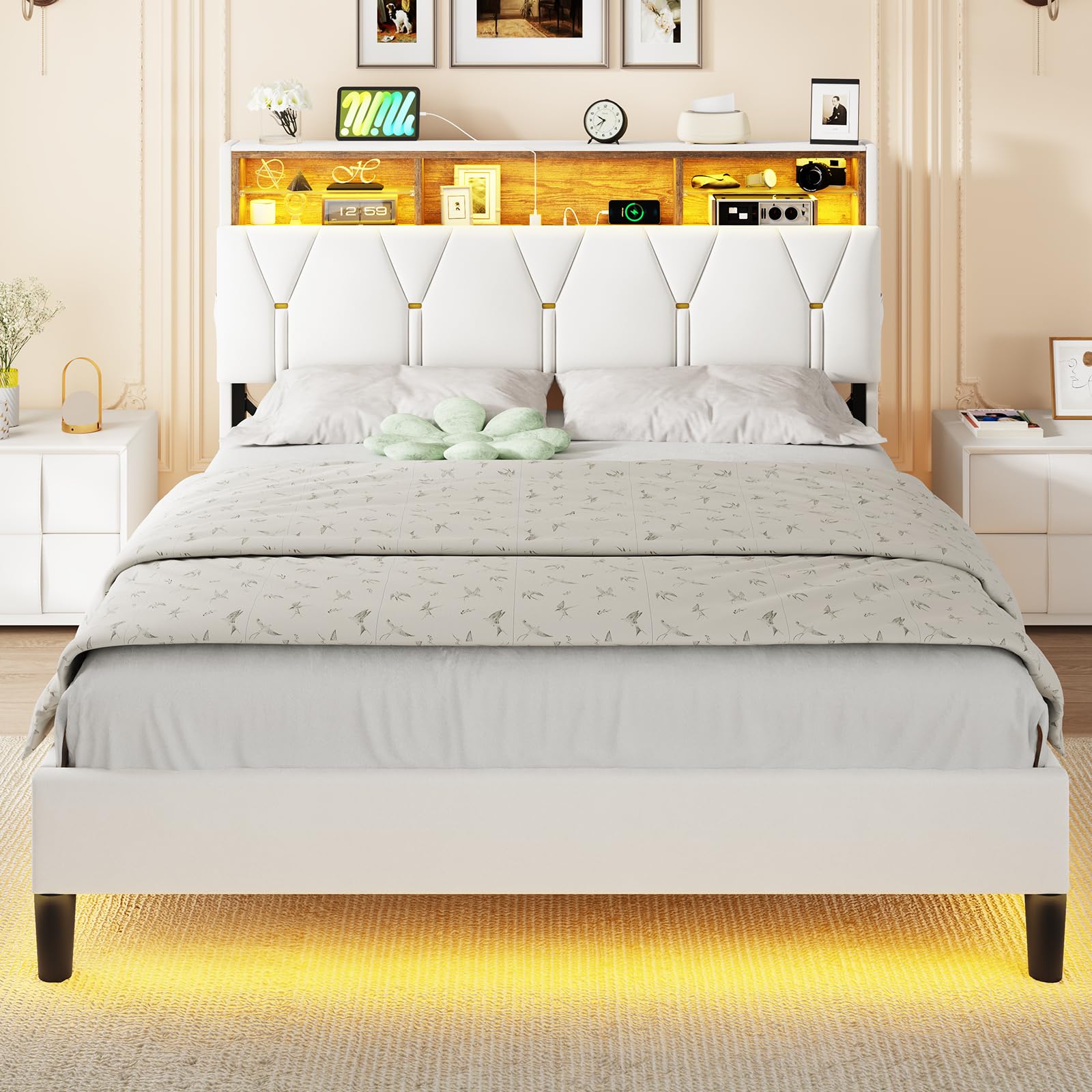 Full Size Bed Frame with Led Lights and Storage Headboard, LED Bed Frame with Charging