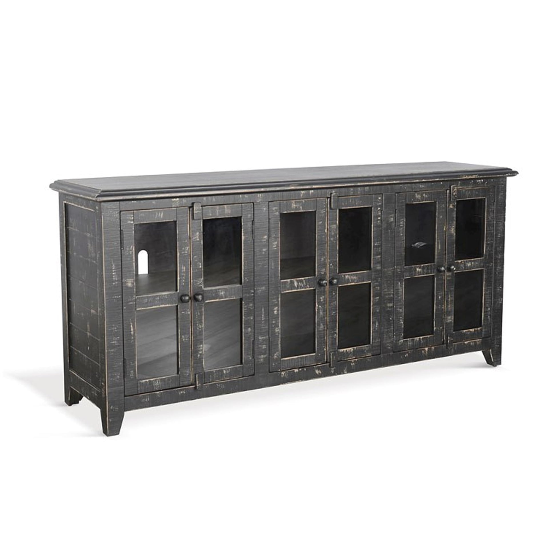 - Distressed black sand finish adds rustic charm to your entertainment space
