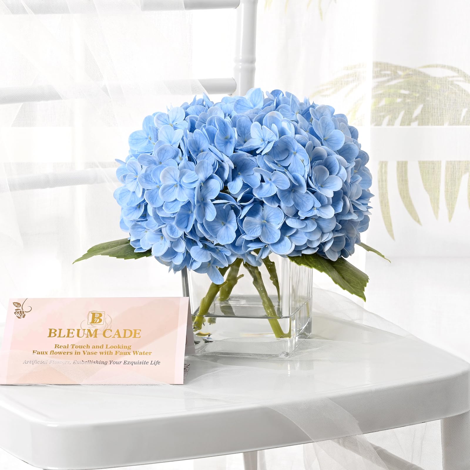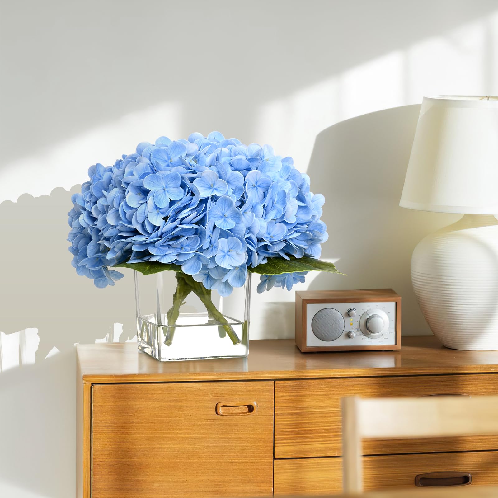 - [Refined Square Vase with Imitation Water]: Presenting an 8.3-inch tall floral masterpiece, featuring a 4-inch high square glass vase with sides measuring 3.5 inches across, contained with crystal-clear imitation water. This visually appealing base perfectly complements the four lush hydrangea blossoms, infusing your space with a touch of understated elegance.