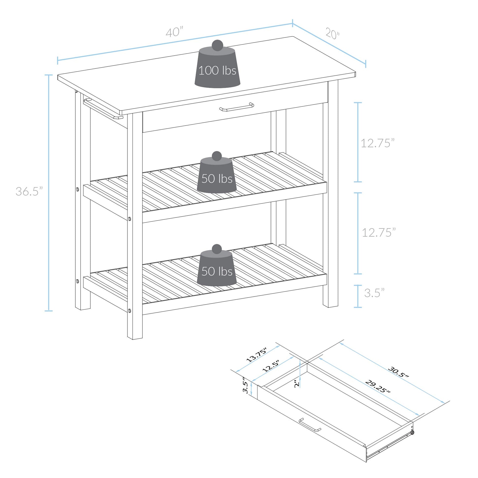 Details: This Kitchen Island cart is the perfect addition to any kitchen that could use some extra counterspace. Its details are manifested in the beautiful finish of the solid wood. 2 shelves and a drawer provide multiple ways to keep your kitchen organized and all of your cooking essentials close at hand.