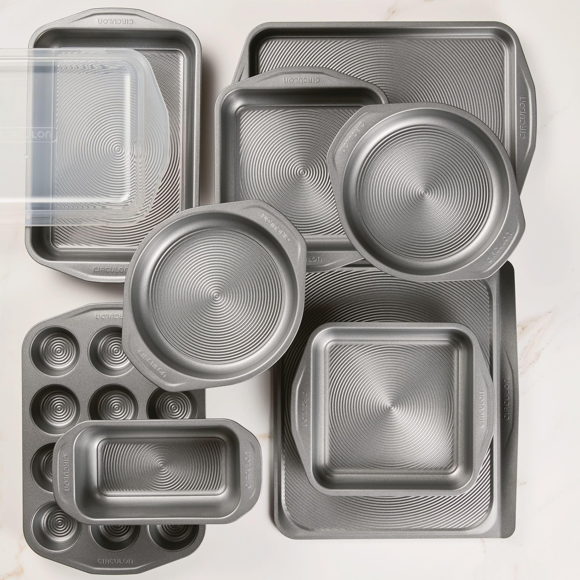 - SET INCLUDES: Two 9-Inch Round Cake Pans, Two 9-Inch Square Cake Pans, 9-Inch x 5-Inch Loaf Pan, 9-Inch x 13-Inch Rectangular Cake Pan with Lid, 10-Inch x 15-Inch Cookie Pan, 14-Inch x 16-Inch Cookie Pan, 12-Cup Muffin/Cupcake Pan