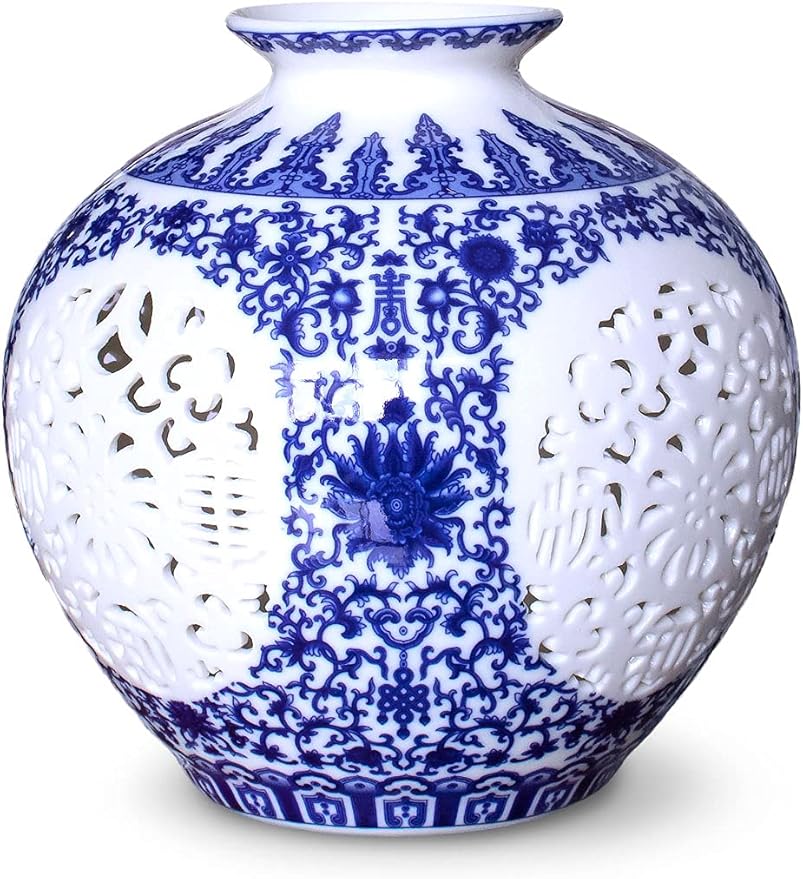 Blue and White Vase, Handmade Chinese Porcelain Flower Vase, Hollow Carved