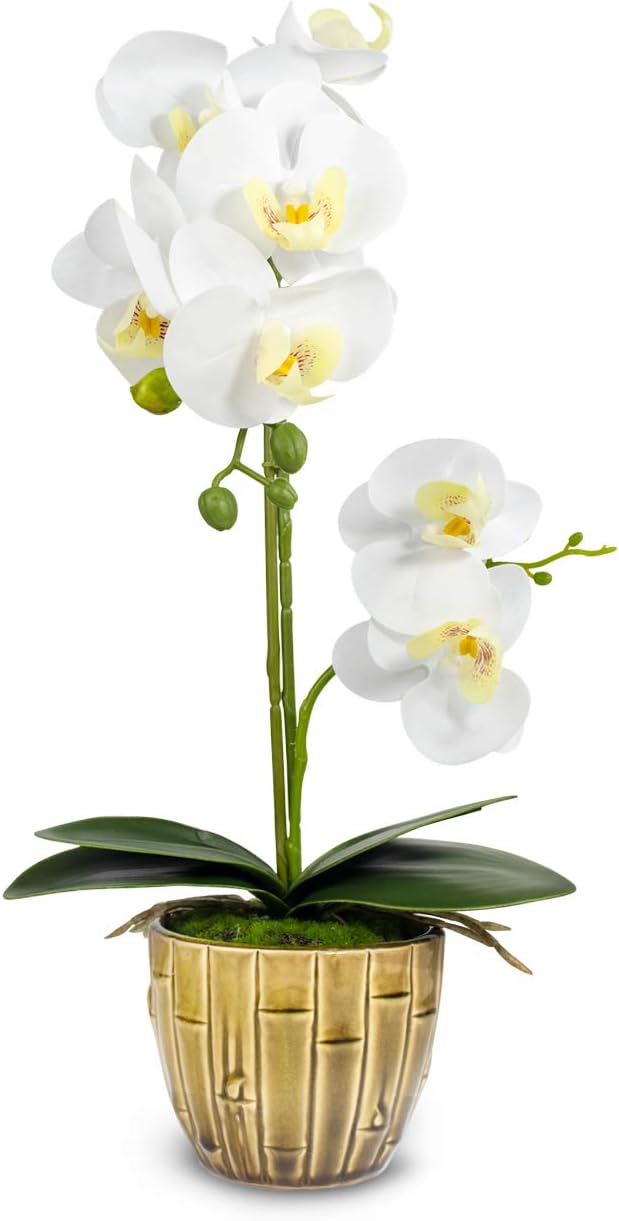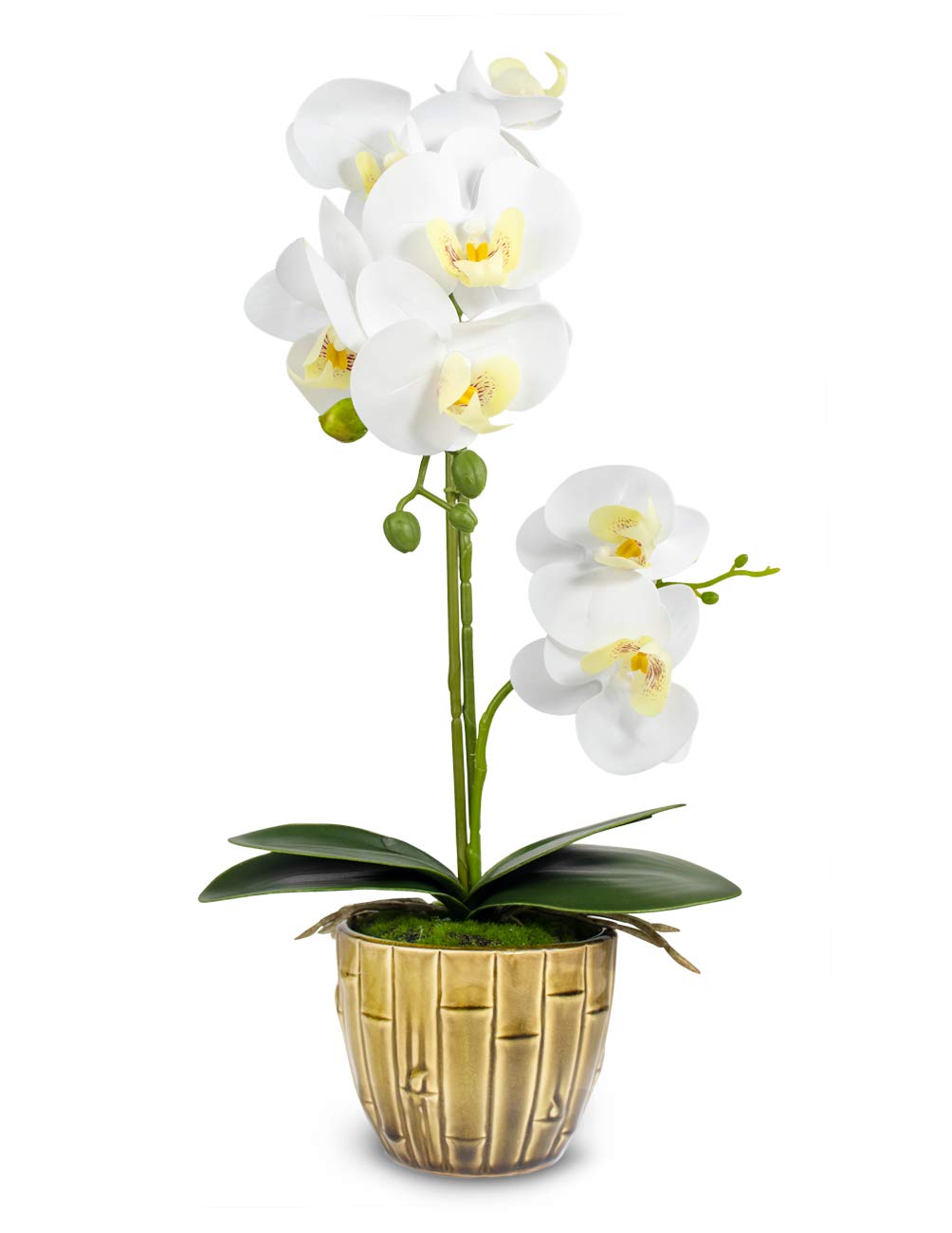 - STYLE: Realistic looking and feeling white butterfly orchid in ceramic pot
