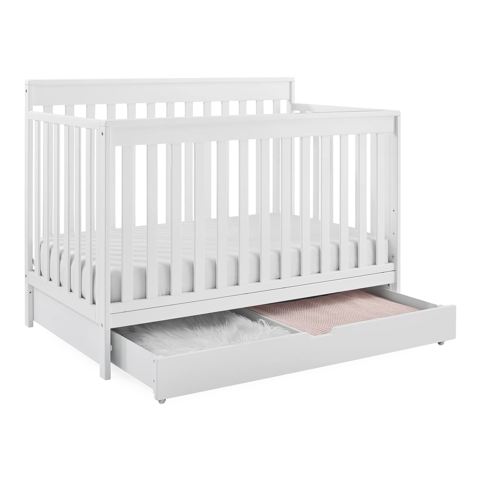 - 6-IN-1 CRIB: Converts to toddler bed, daybed, sofa, full bed w/ headboard/footboard & full bed w/ headboard only (Daybed Rail included; Toddler Guardrail #0096/Full Size Rails #0050 sold separately) | Included trundle has wheels for easy use