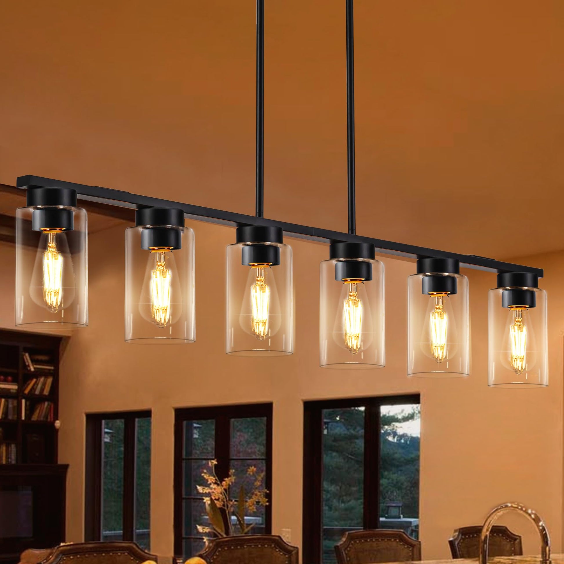- [Nice Material] The 6-lights kitchen chandelier is made of high end metal and high clarity glass material. The metal material is black in color to cater to a variety of interior decorating styles. The clear glass material used in the dining room light fixtures over table is easy to transmit light and provide better lighting function.