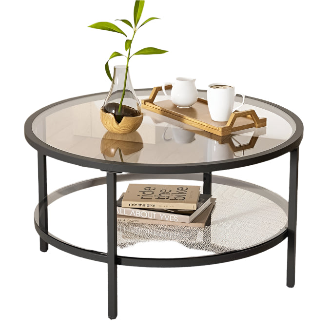 - Functionality and Aesthetics. This Round coffee table features a 2 tier Unbreakable Glass Top - adds a touch of modern sophistication, its lower shelf offers a practical area to showcase your preferred books and decor items. It boasts a sturdy construction and you can easily store and grab books, magazines, snacks in the open storage space.