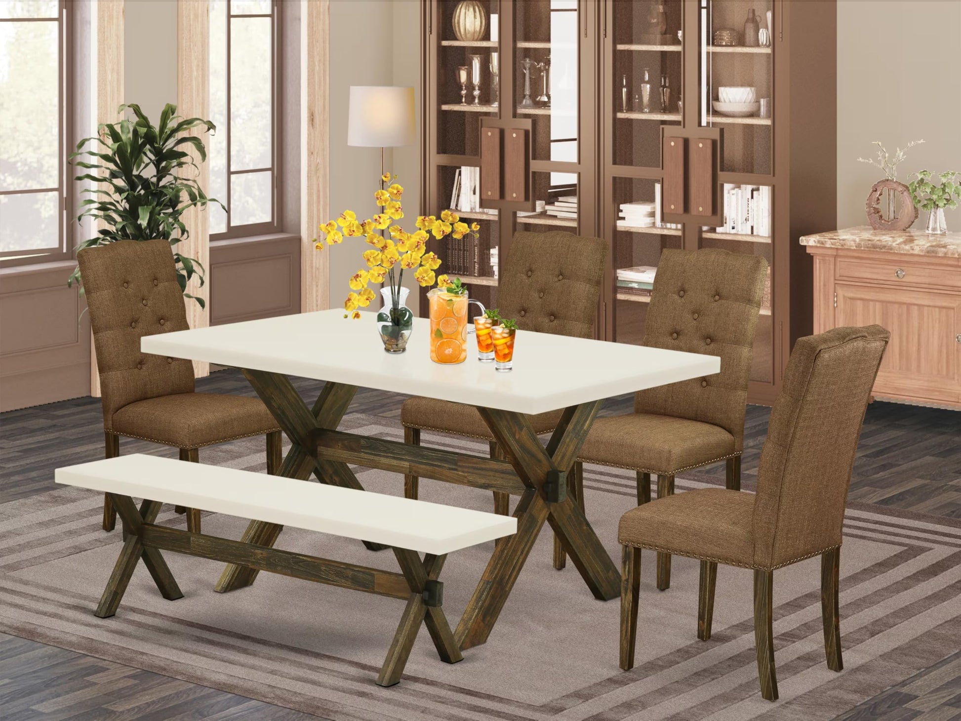 - DINNER TABLE SET FINISH: We manufacture a dining set featuring a rectangular table and bench with Linen White tabletops and legs finished in Distressed Jacobean wood. The kitchen chairs in this set have Linen Fabric seats and Brown Beige backs, also with a Distressed Jacobean frame finish. This exquisite dining ensemble offers a captivating blend of colors and styles, making it a versatile addition to any room's design.