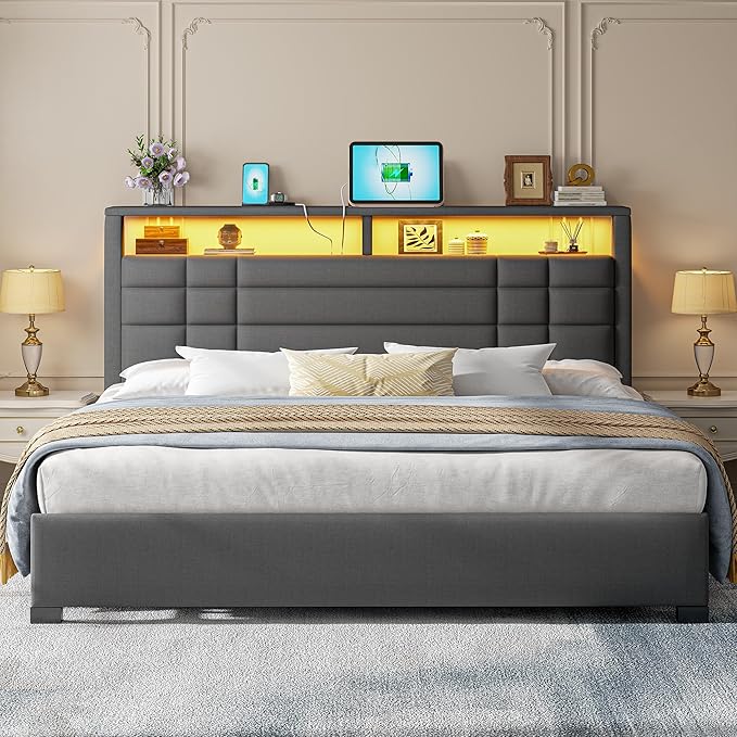 Queen Bed Frame with 2-Tier Storage Headboard, Queen Size Bed Frame