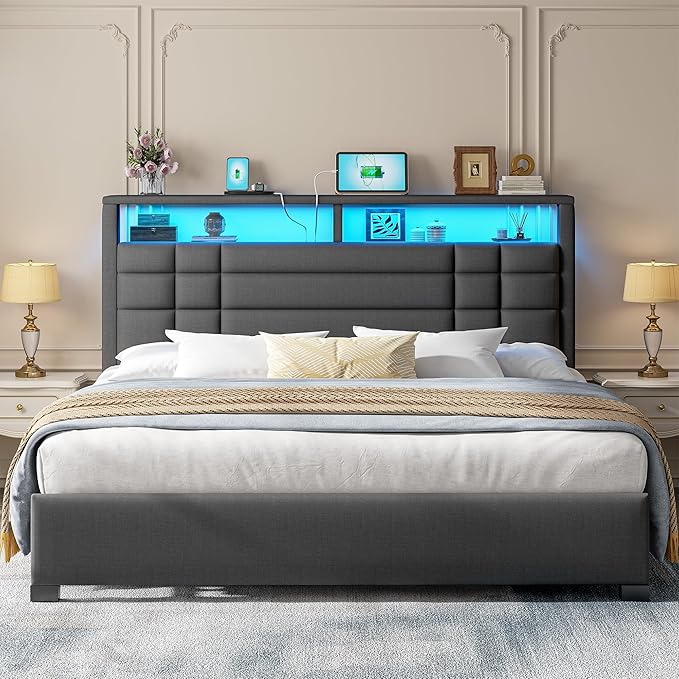 - The queen bed frame with headboard features a RGB LED lights that can be controlled via remote or App, allowing you to freely switch between 60,000 colors.It offers modes including dynamic mode, music mode, microphone mode and timer mode to adapt to various scenarios and emotions.You can also adjust the brightness to use it as a night light, creating a warm and cozy bedroom atmosphere while helping you move safely in the room without turning on the main lights.