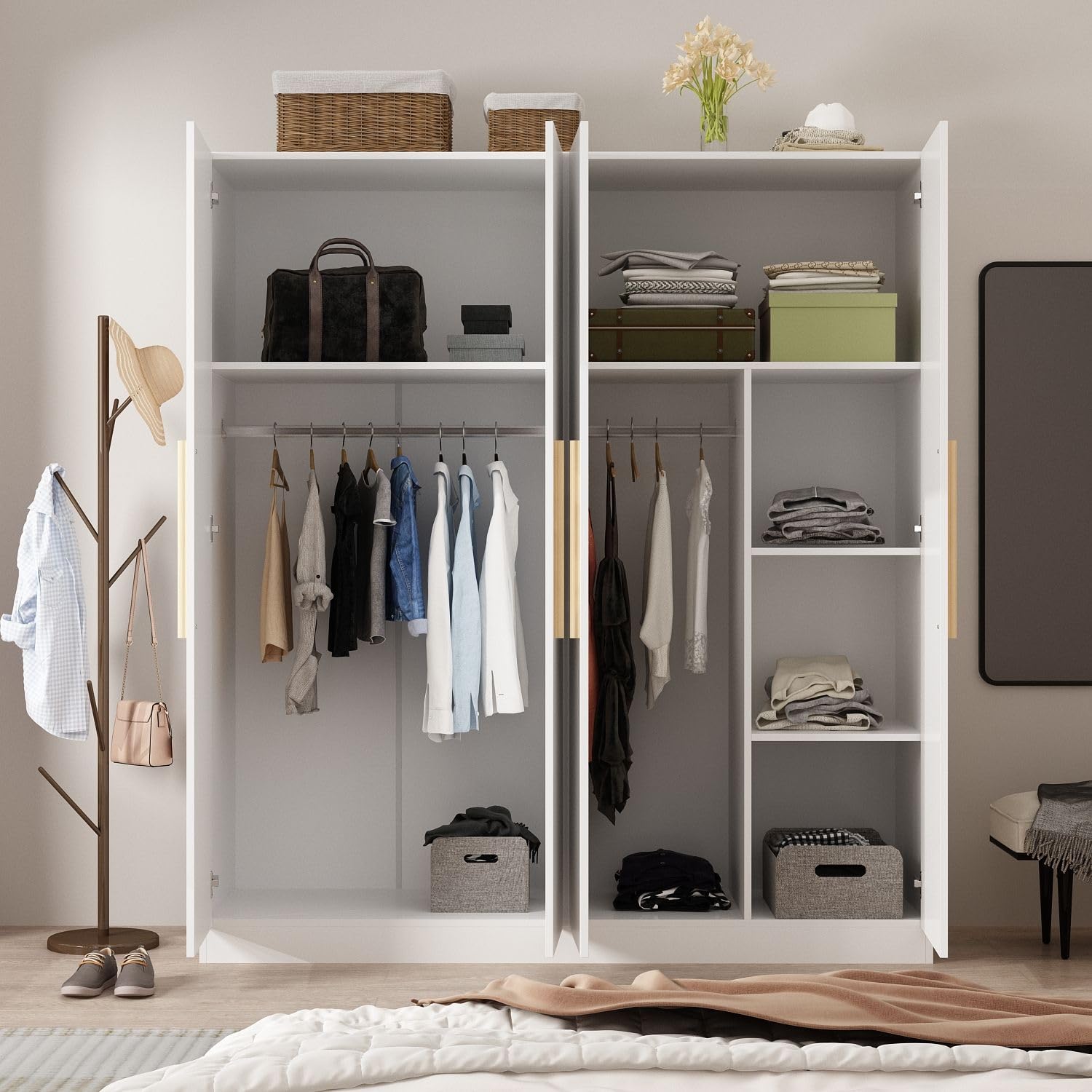 - Plenty of Storage - This 4 door wardrobe is really multifunctional for storing your household items in your bedroom. The left cabinet is specially for storing your clothing and making your clothes well organized. The right one features different size of shelves mainly, which make it possible to store bedding or household stuff.