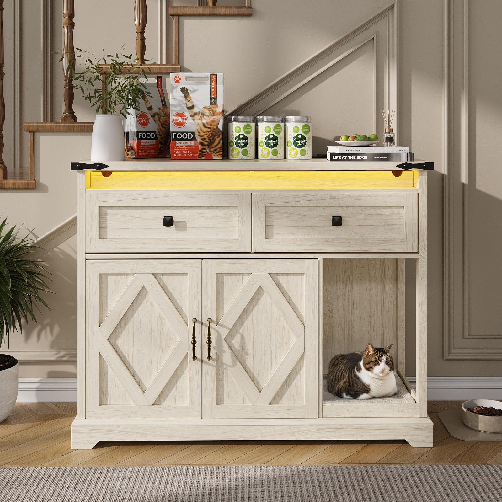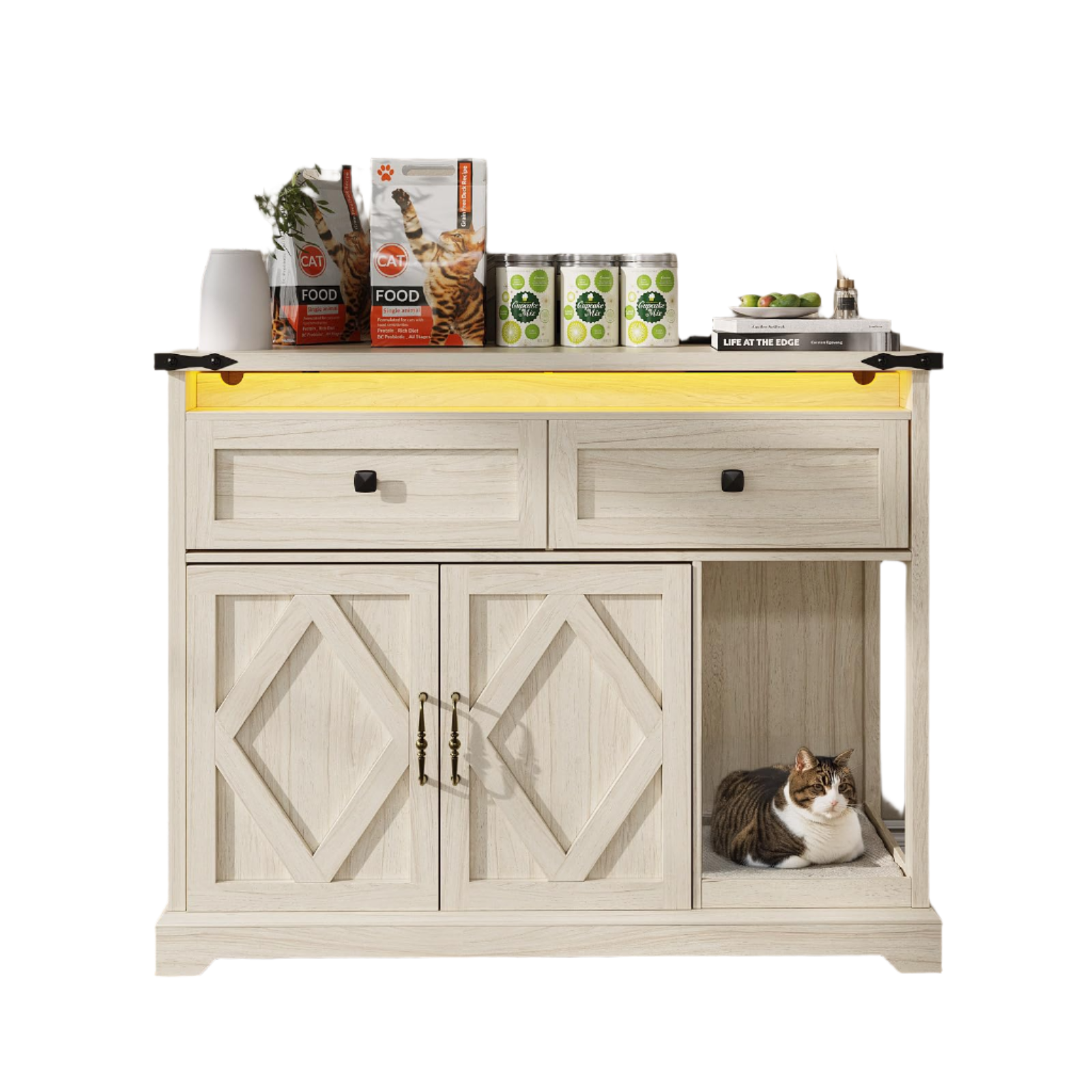 - Flexible Storage Cabinet: Fixed with a range of different storage solutions, including shelves, drawers, and open space. The hollow design of this storage space can be placed high-frequency use items such as art ornaments, tableware, plants and even small appliances for pets like water fountain,feeder, the space also can as a cat bed. You can make sure space is used as efficiently as possible. Making it ideal for keeping your space organized and clutter-free