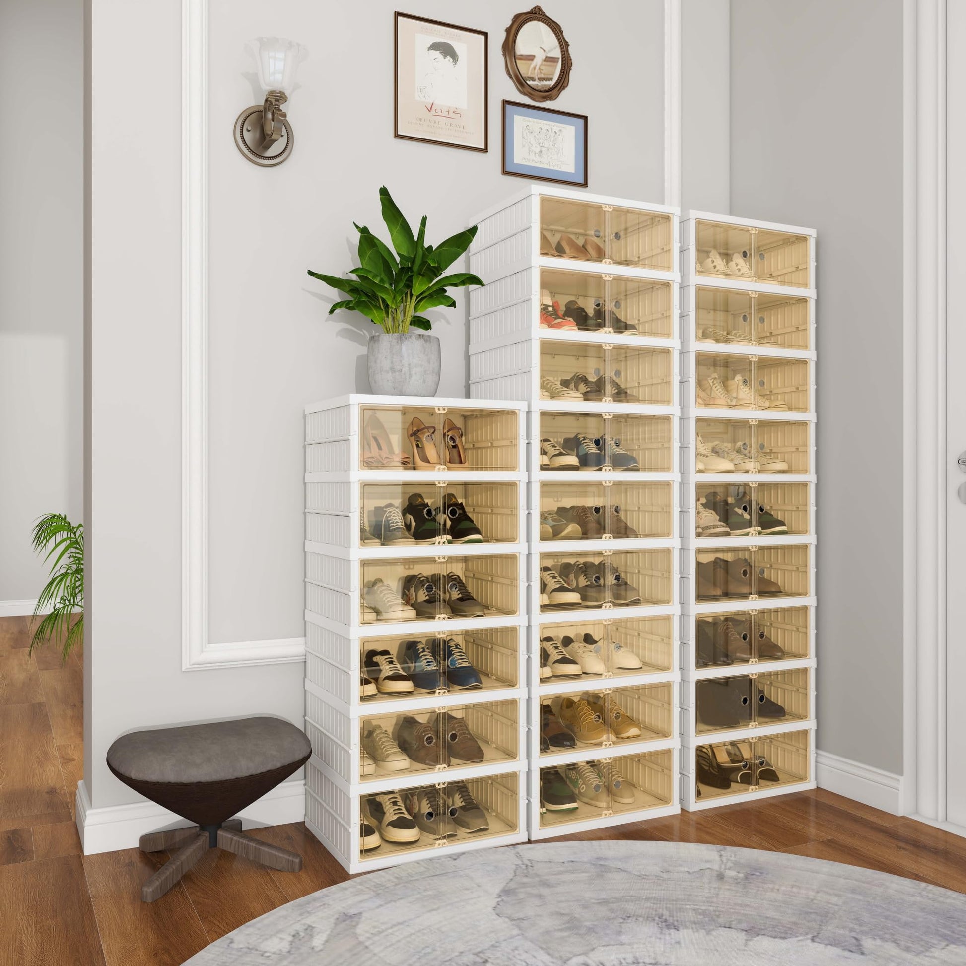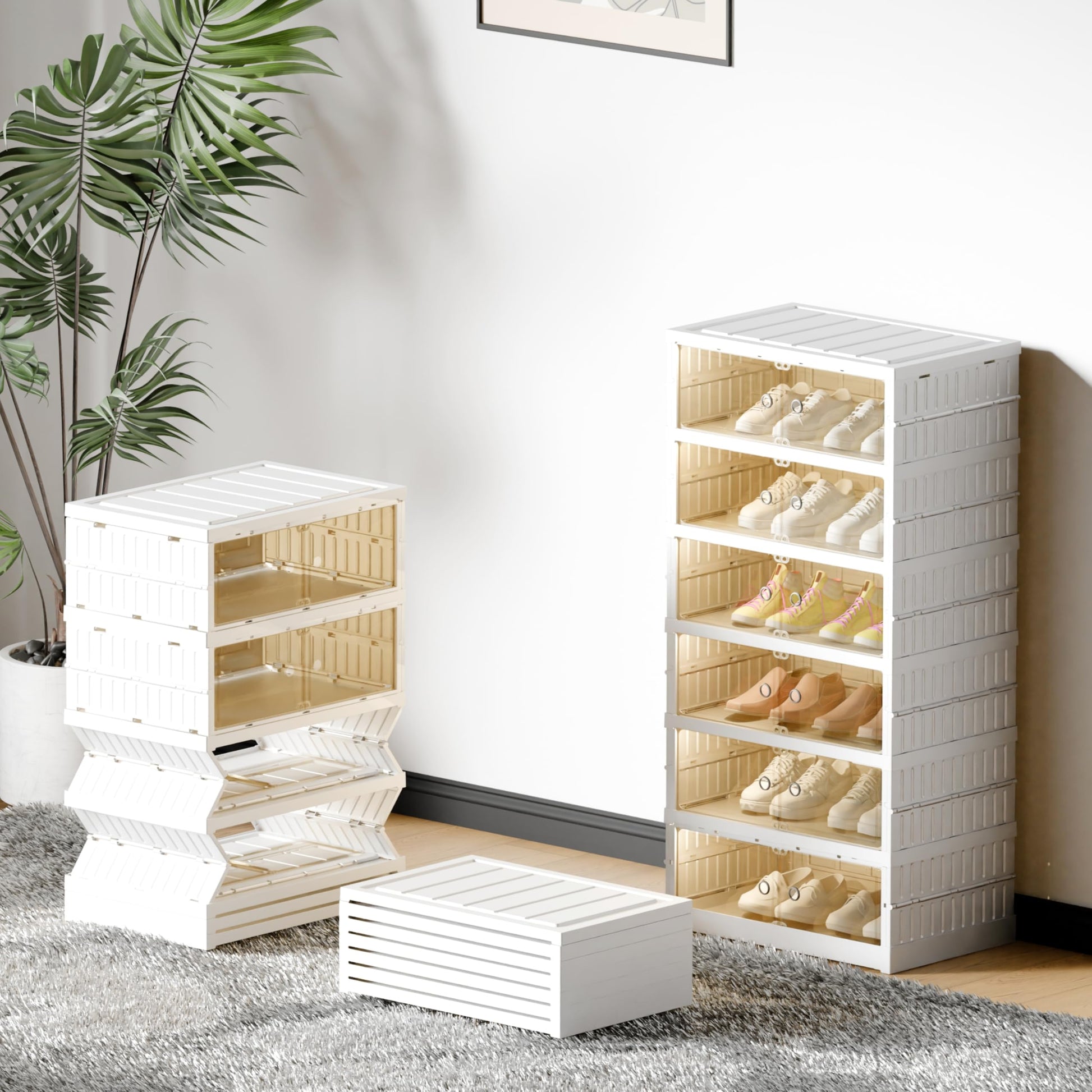 - FOLDABLE INTEGRATED FRAMEWORK: The foldable shoe rack shines with an integrated, user-friendly design that avoids the hassle of complex assembly. This design saves you precious time, effort, and space. When not in use, the plastic stackable shoe rack can be smoothly folded, showcasing its excellent space-efficiency.
