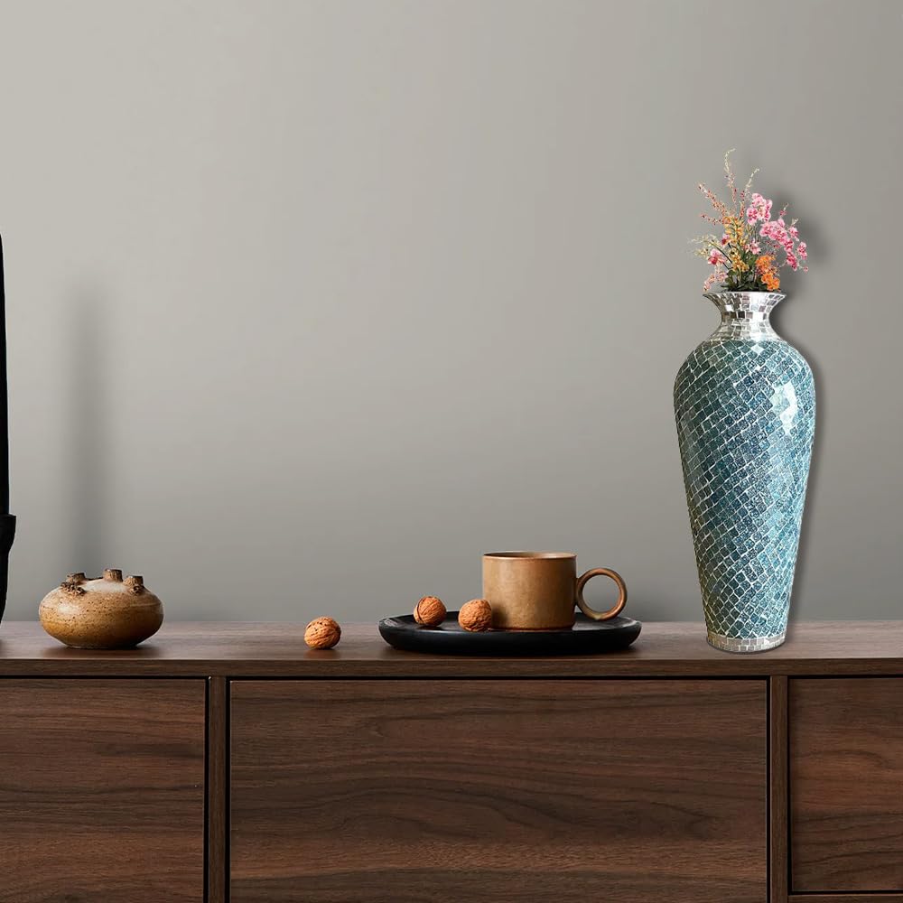 - The Bella Palacio decorative tall floor vase is constructed of durable iron and is covered with turquoise Arabesque-shaped glass mosaic tiles. Each vase is covered with shimmering turquoise & silver tiles and the top rim is hand-painted silver. This 20 inche Vase is 6 inches wide with a tapered base and weighs 6 lbs. Each is handcrafted and contains slight variations & imperfections that are an inherent part of the charm of artisan-crafted goods making each piece truly one-of-a-kind.