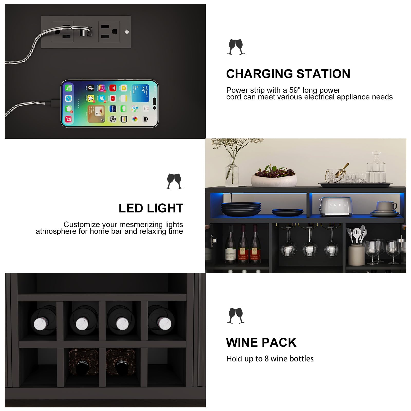 Fluted Home Bar Wine Cabinet with LED Light, Charging Station, Wine Rack - Buffet Cabinet with Storage, Coffee Bar Table, Stylish Fluted Credenza Cabinet for Modern Home Kitchen 47.2" Black
