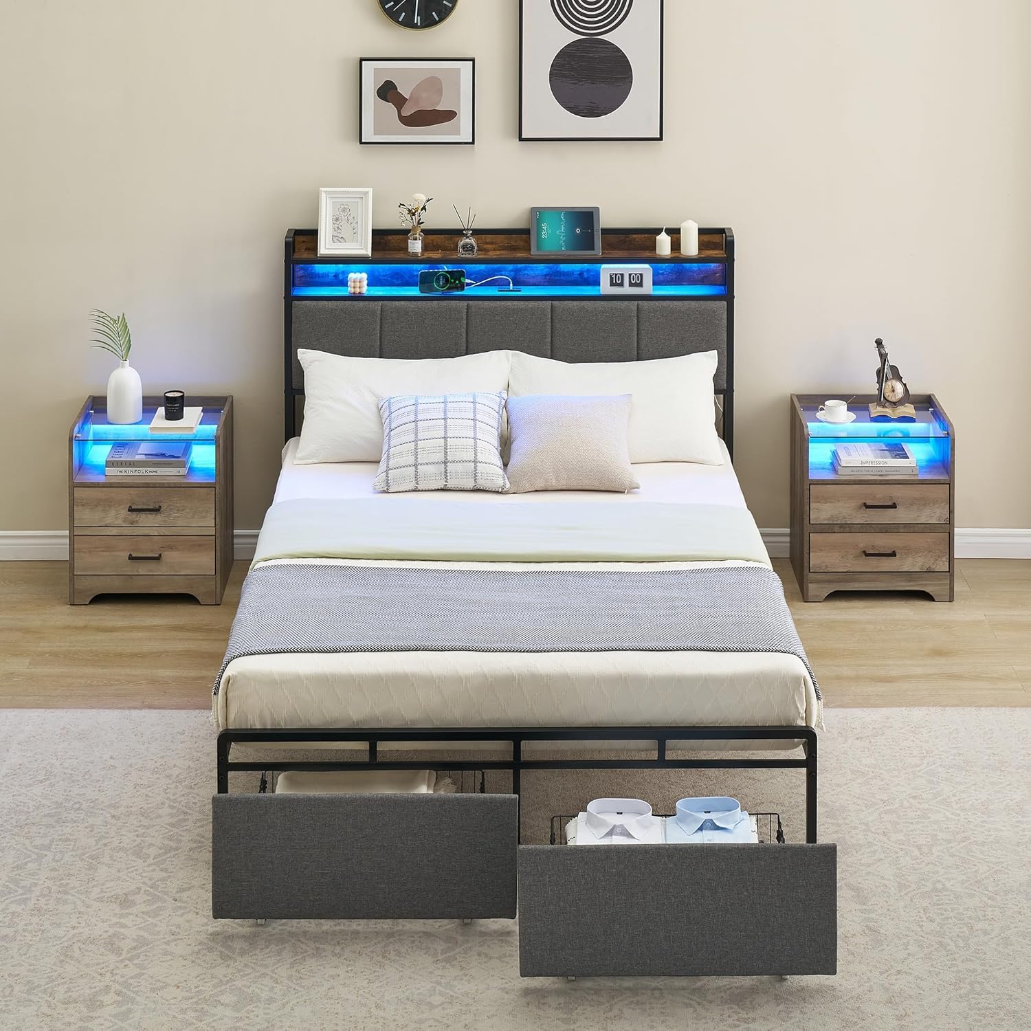 Full Size Bed Frame with Storage Headboard Led Lights Charging Station