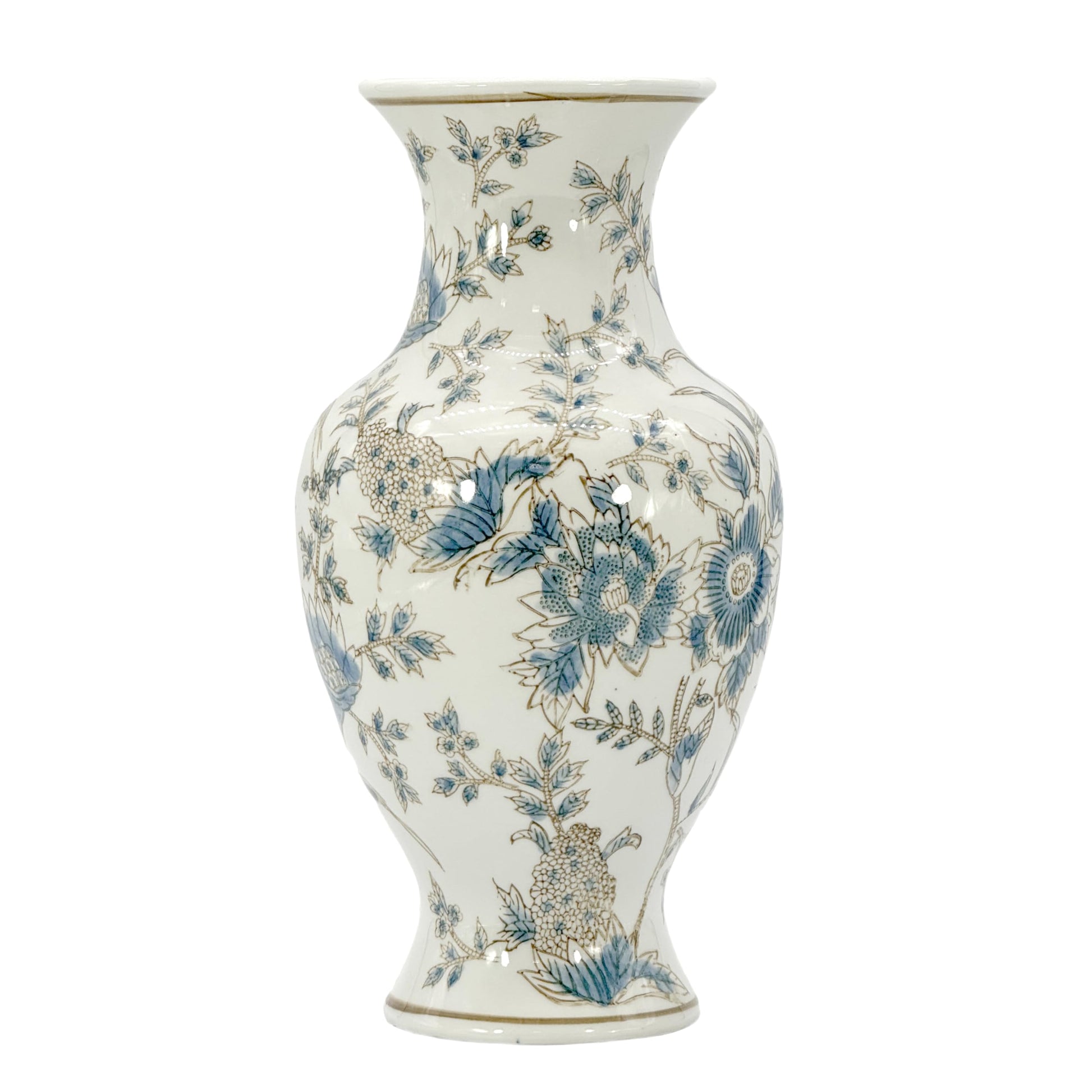 White & Blue Floral Chinoiserie Ceramic Vase 14" - Hand Painted Antique Style Porcelain