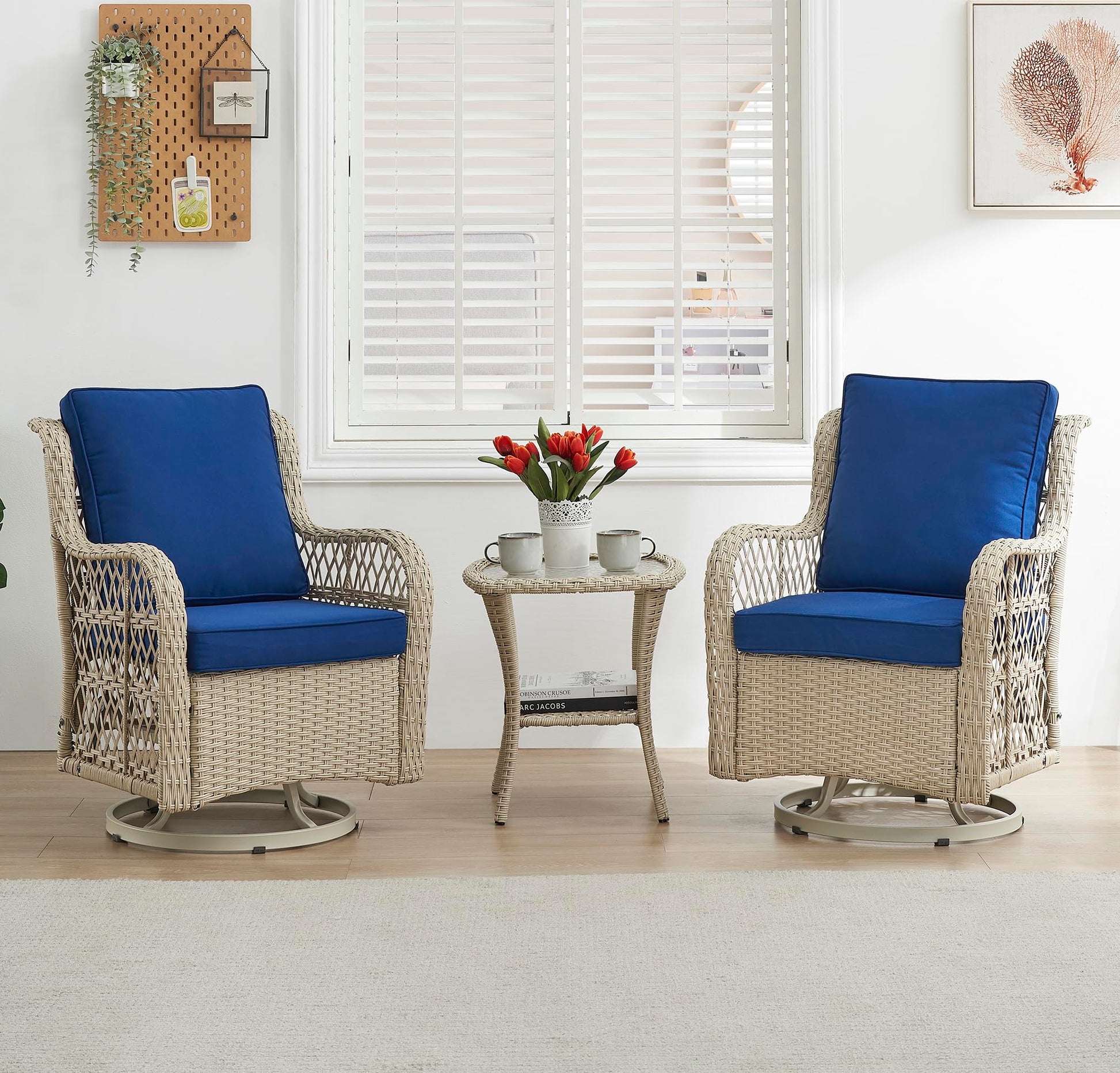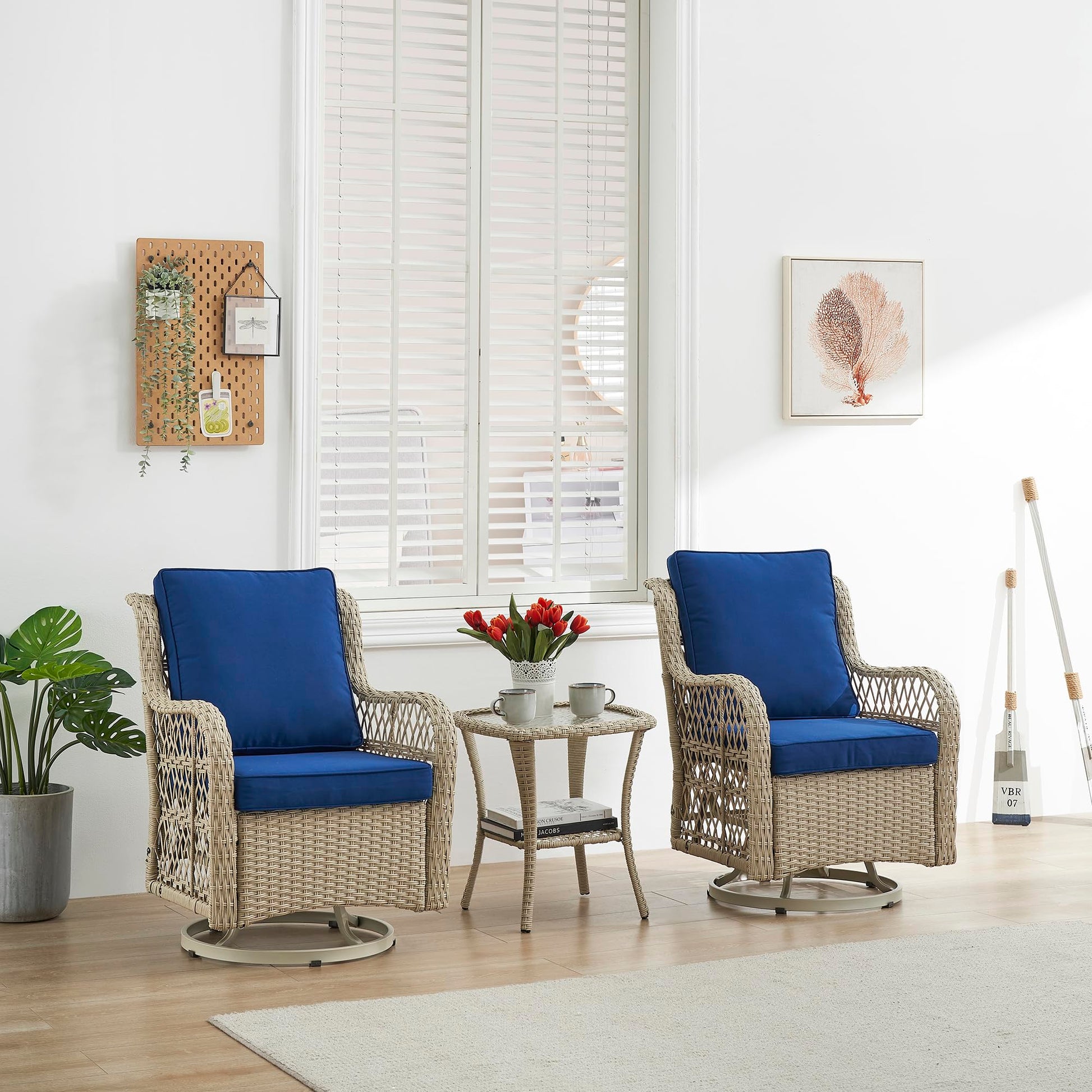 - Unwind in style with 2 wicker swivel rocker chairs and a tempered glass side table. Sturdy chairs support up to 200 pounds each, while the table holds up to 50 pounds. The elegant dark brown wicker and blue cushions add a touch of sophistication to your outdoor living space.