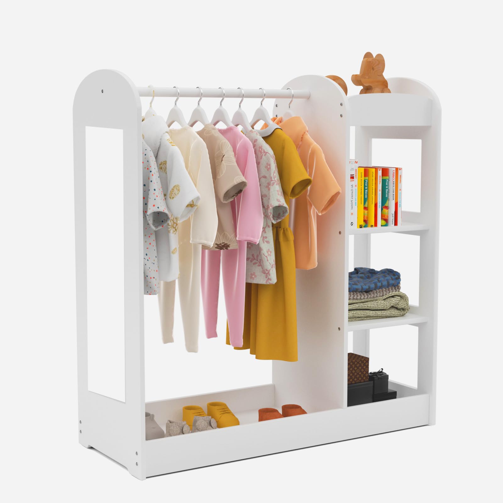 - Glaf open kids wardrobe has a huge storage space including 4 open shelves, 1 wooden hanging bar and 3 extra hanging brackets, accommodating a wide range of items such as clothes, shoes, toys, books, and decorations, which will satisfy your daily organisation and storage. Also, there is a full-length acrylic mirror on one side that won't accidentally break, so kids can safely enjoy their daily outfits.