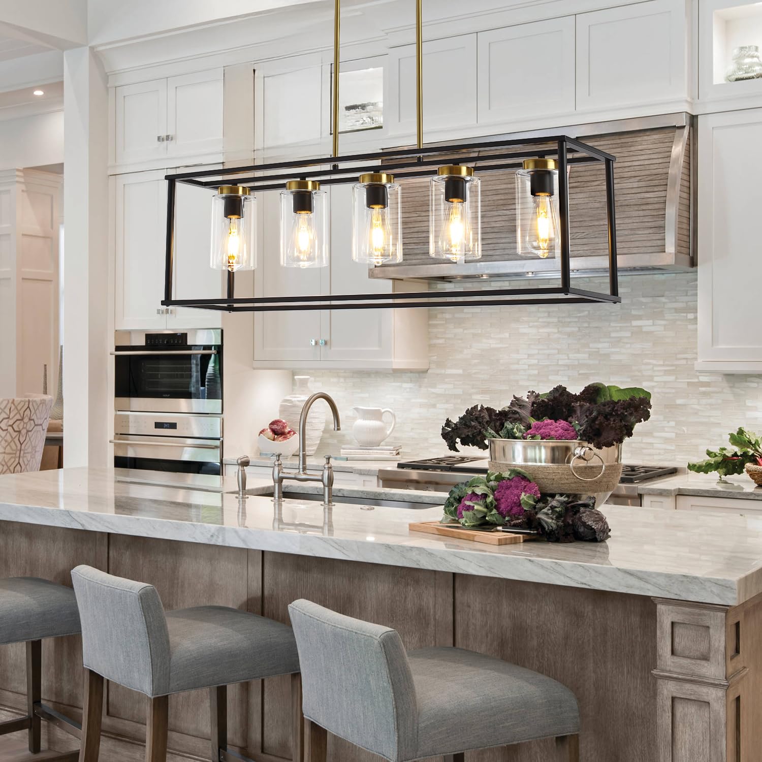 - Dining room light fixtures over table,simple but stylish design clean linear square 5 light,pendant lighting for island with black and brass finish suit for modern and Industrial style. It also with clear glass shades has great transmission, which will illuminate all-round without dazzlation.