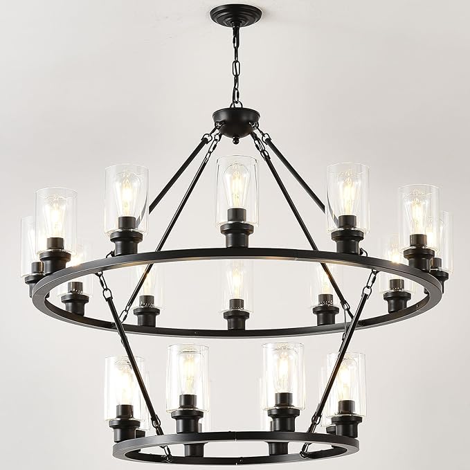 Black Wagon Wheel Chandelier 32 Inch Modern Farmhouse Glass