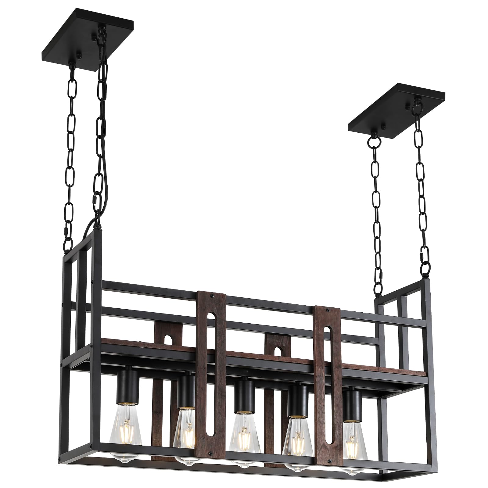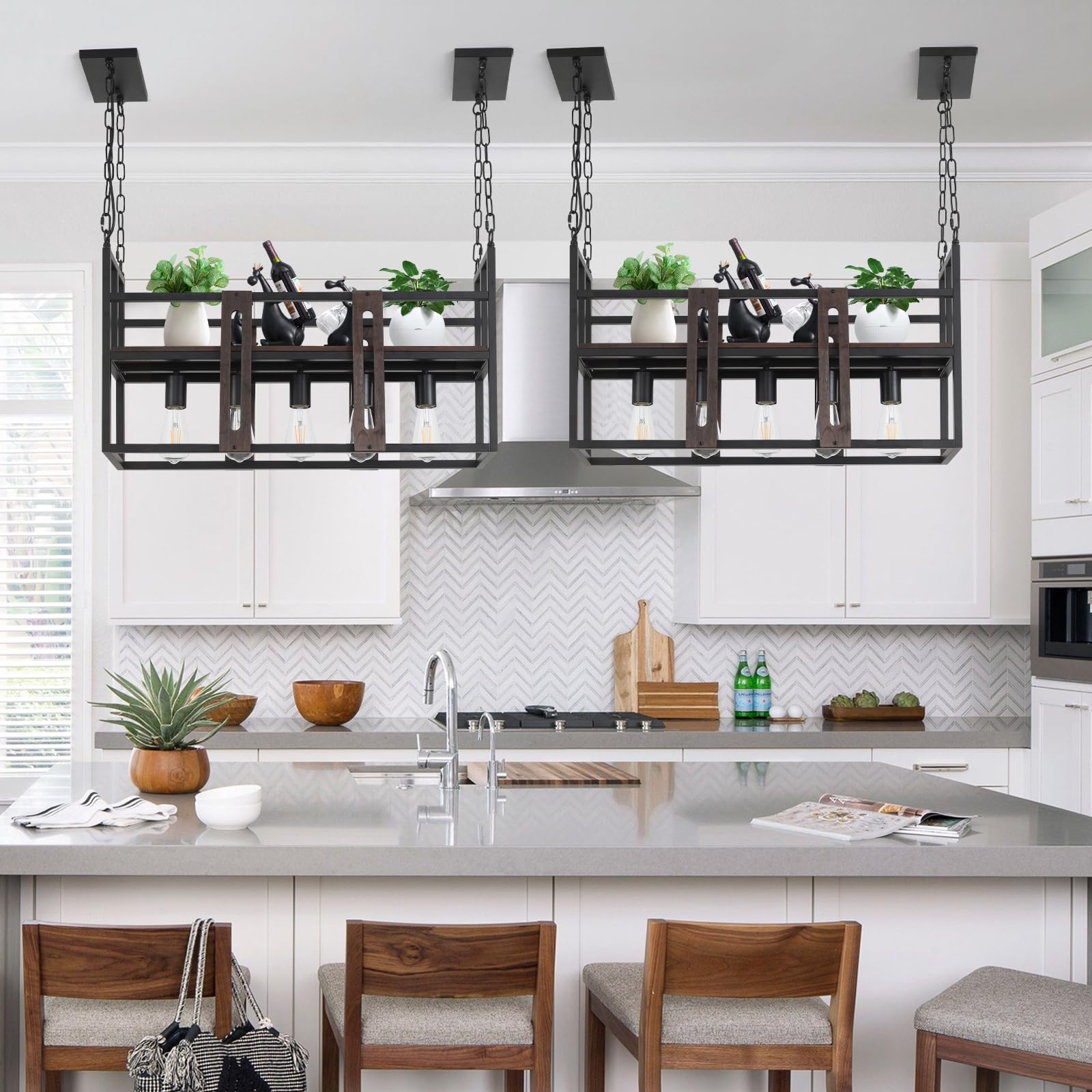 - Industrial Design:The Island Light is designed with a classic rectangular frame, featuring a matte black metal, adding a touch of elegance and style to your kitchen or dining room.Adorned with farmhouse style wooden pieces, this kitchen pendant lighting over island infuses a rustic and vintage aura, accentuating your unique home ambiance.