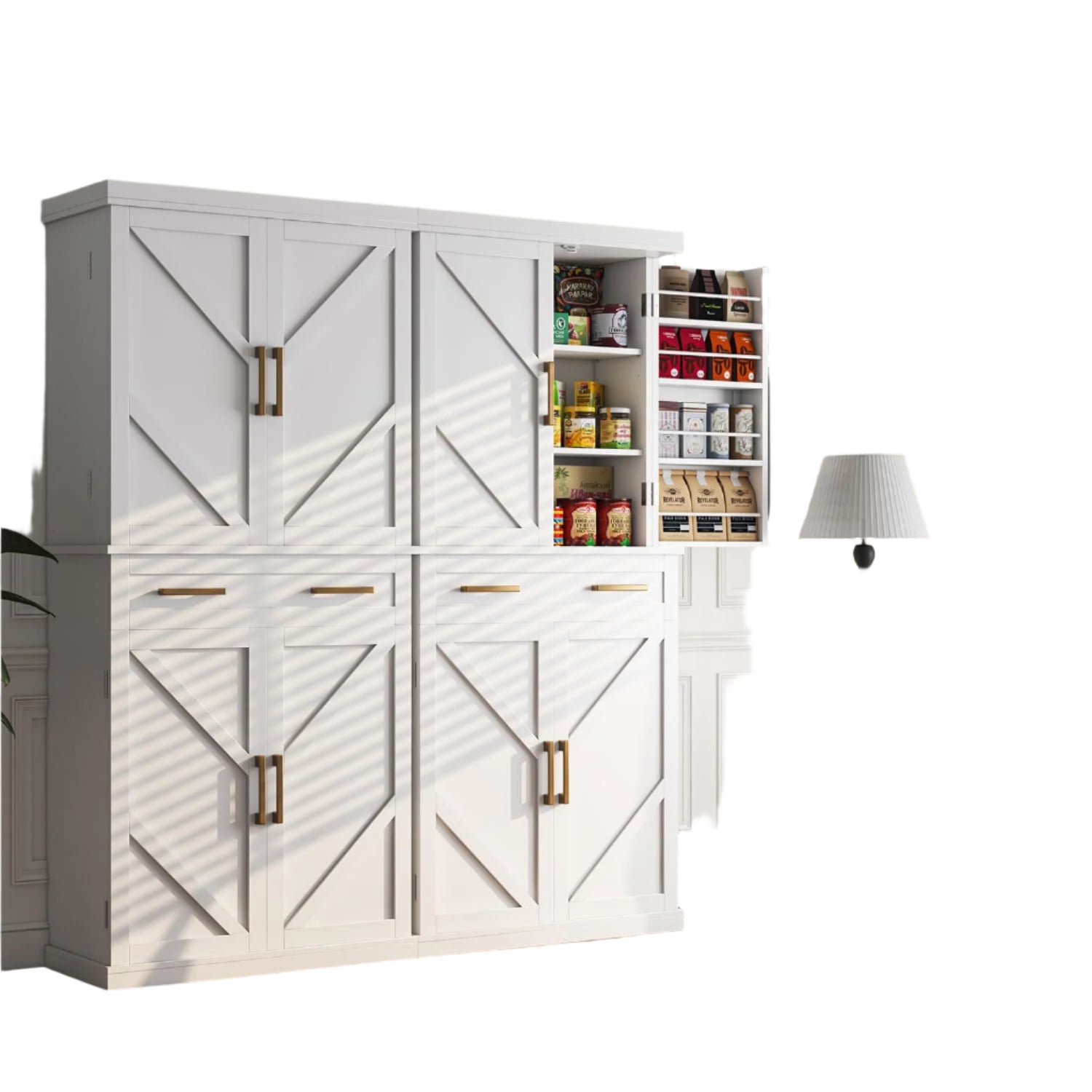 - Large storage space: Our wooden large pantry cabinet offers 15 storage compartments, including 8 cabinet door storage spaces, 6 interior shelf spaces and a spacious drawer, complemented by 6 adjustable shelves. Whether you're storing canned goods, snack packages, bottled beverages, pots and pans, everything will have its ideal place that ensures your kitchen stays neat and organized.