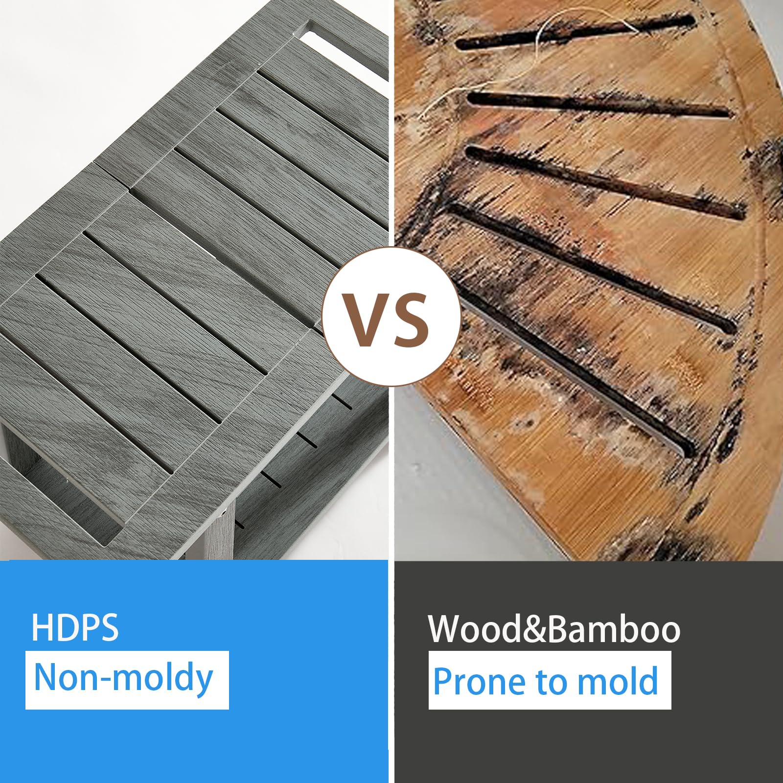 - 【Durable Material】HDPS is a material which looks like natural wood, it has a nice grainy feel. The screws are using 304 stainless which never gets rust. The shower bench performs better than wood in terms of water resistance, weather resistance, scratch resistance, stain resistance. Perfect for enduring bathroom conditions, making it the smart choice for those who value both aesthetics and long-lasting quality.
