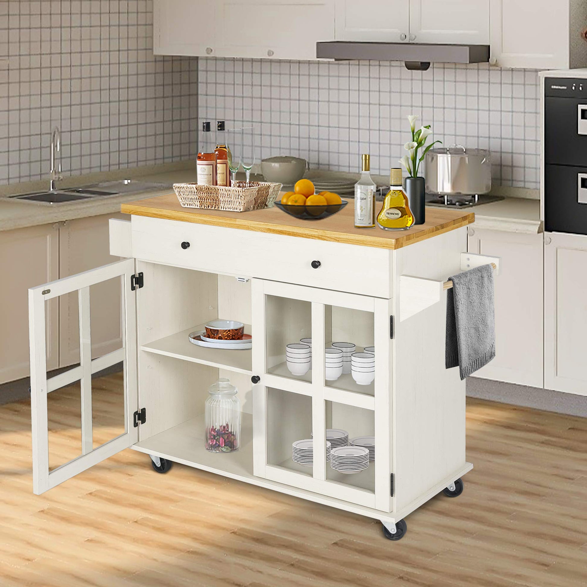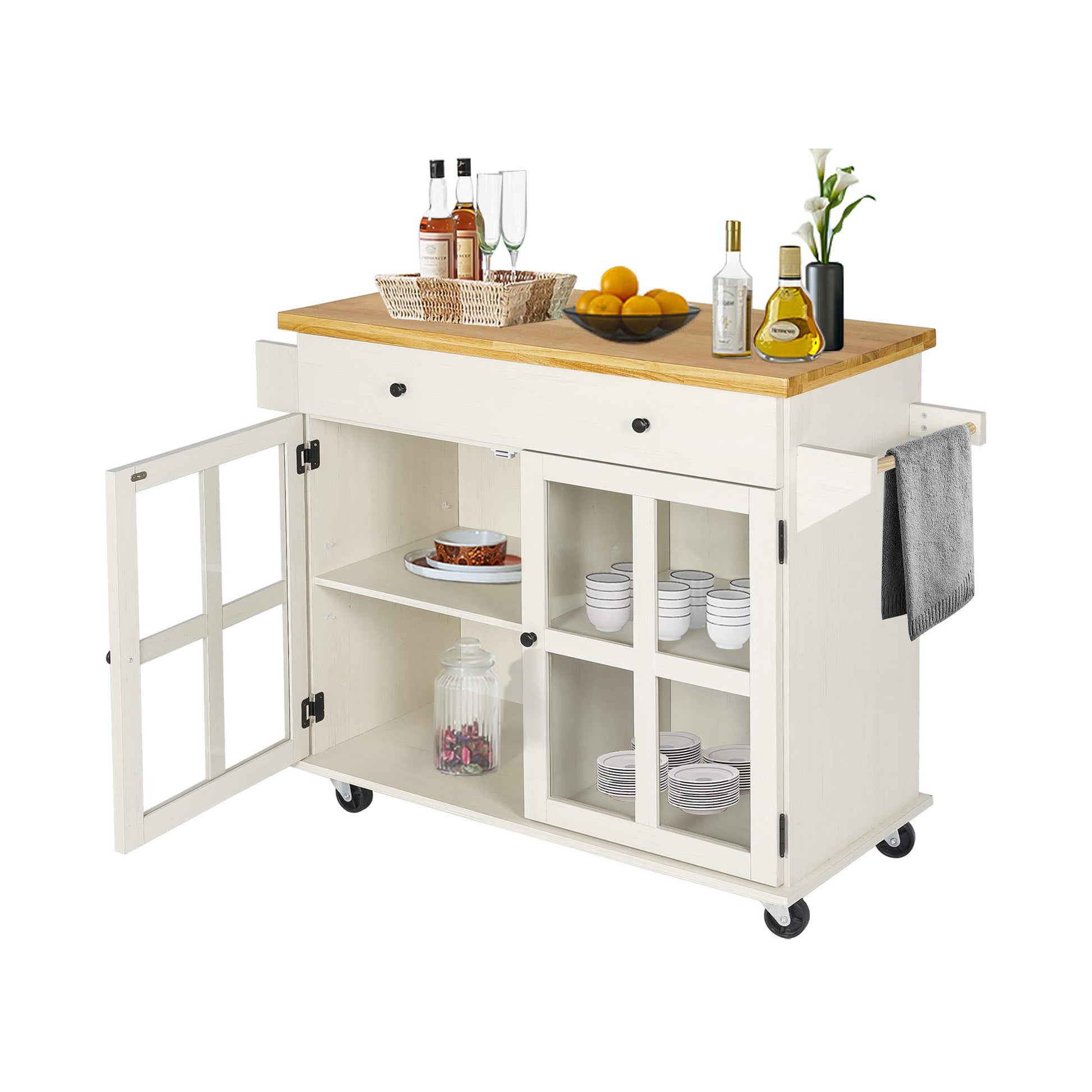 - This LAZZO Kitchen Island has large pine tabletop, which could place vegetables, spices, wine,fruits. The big storage drawer and the spacious cabinet could provide enough space to storage knives, scoops, plate, forks and so on. Featured with side small bottle rack and side towel rack/handle.Keep ingredients and tableware in order, this kitchen island is equivalent to a mini kitchen, which you could store utensils and ingredients you need, greatly saving your cooking time.