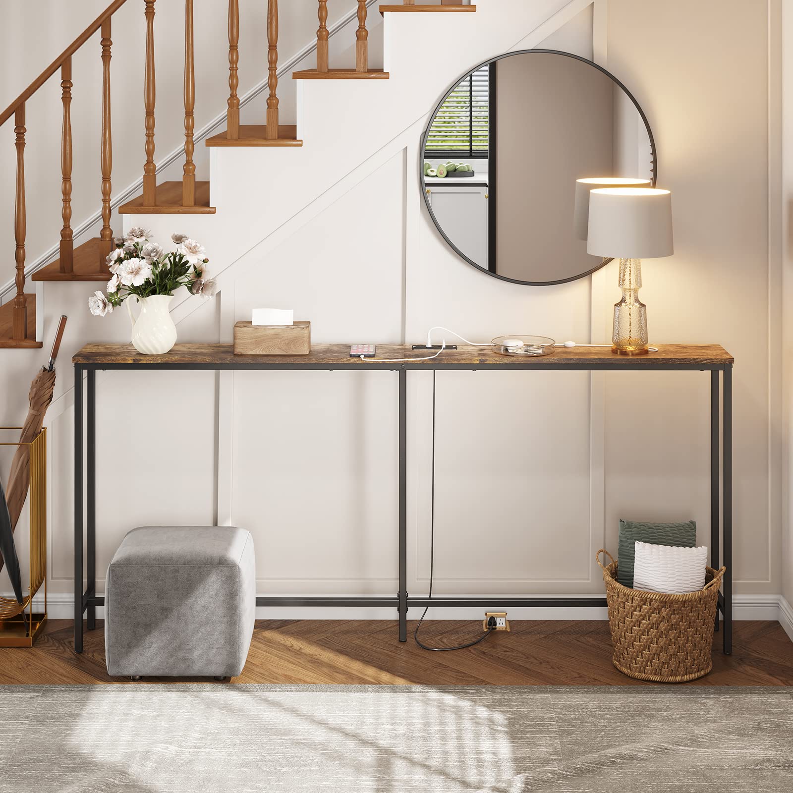 - Built-in Power Outlet: The long console table comes with two built-in plug outlets, two USB ports, and a 59 inch power cord, making it convenient to plug in lamps, phones, headsets, iPads, laptops, fans, decorative light strings, and other electronic devices without worrying about low battery. It is also an excellent choice for printers, photo printers, and laminators.