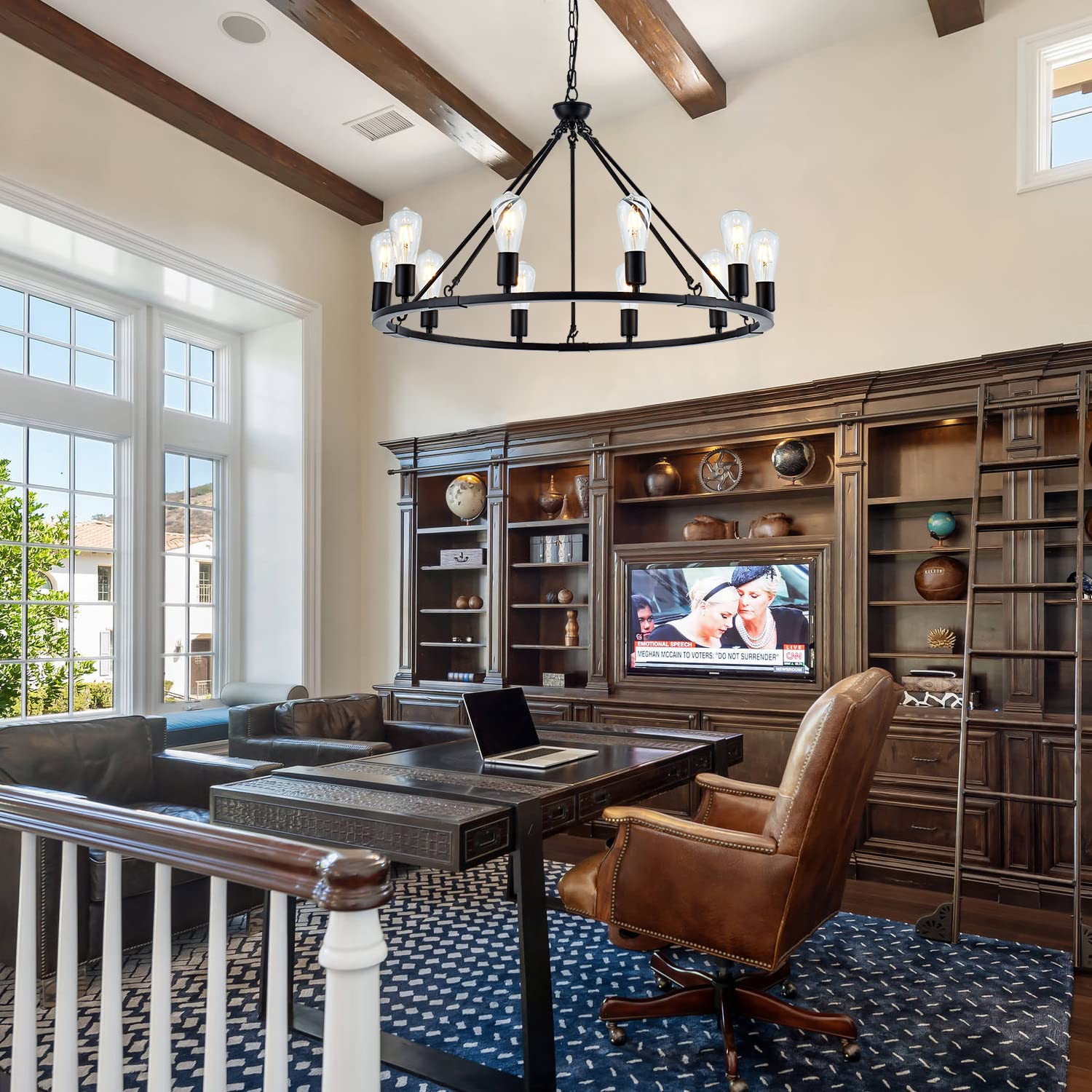 - The vintage wagon wheel chandelier full of allure, it comes with matt black high-quality metal lamp body and 10 lamp heads, fully lighting up your house with a retro atmosphere and comfortable feeling.