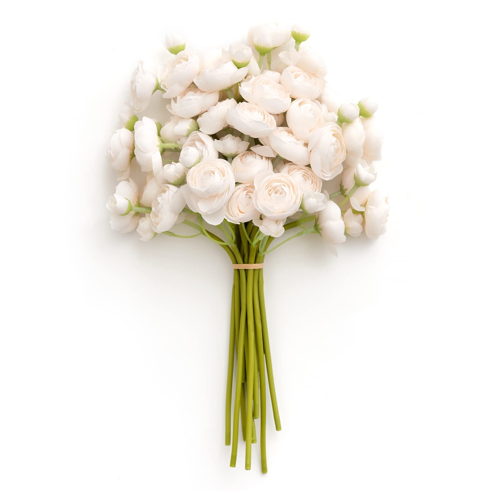 - Package Details: The package includes 18 pieces of mini ranundculus flowers with stems. Two blooms and two buds on each stem. The blooming flowers are approx 1.2 inches wide and the flower buds are approx 0.5 inches wide. 10.5 inches long from the top of the flower to the end of the stem.