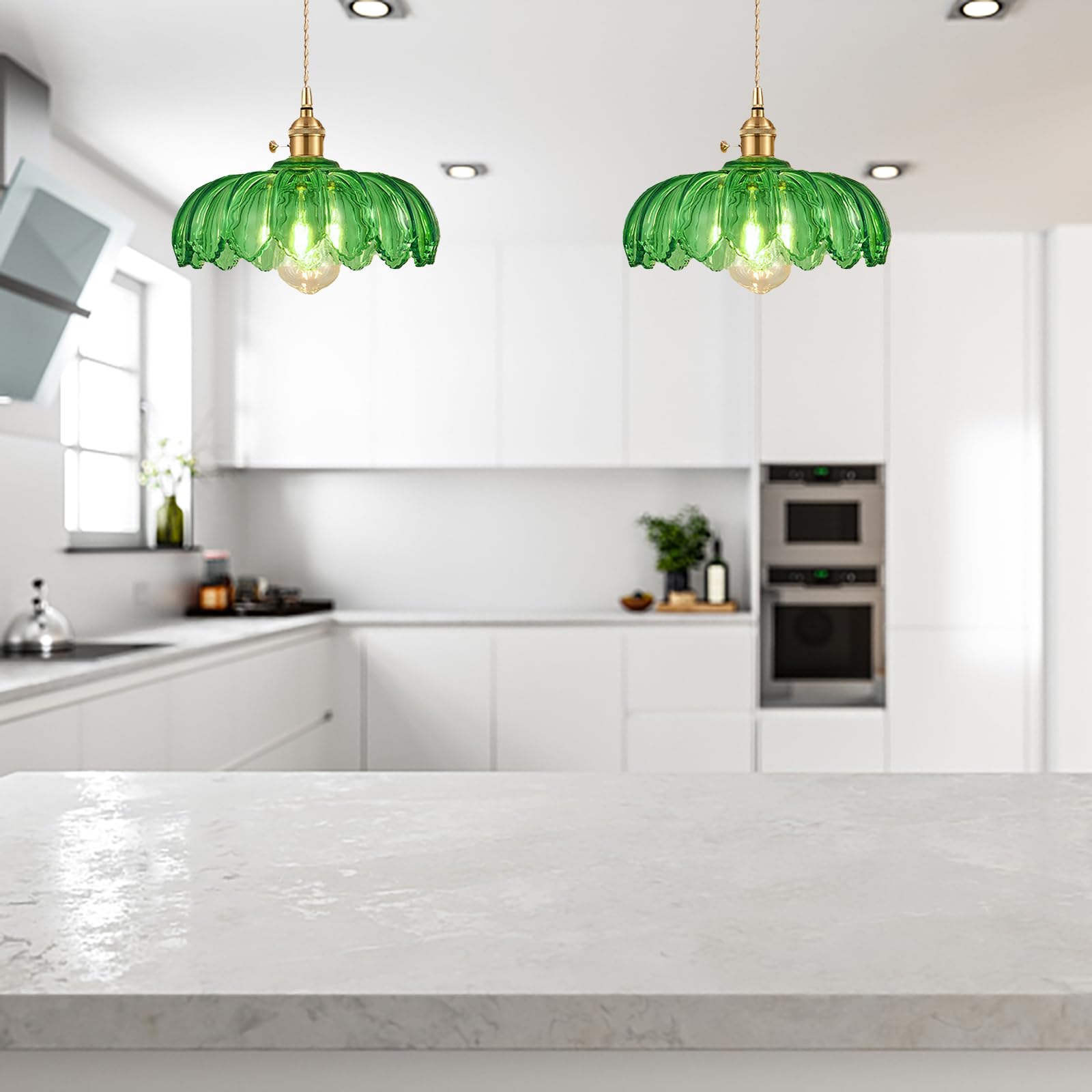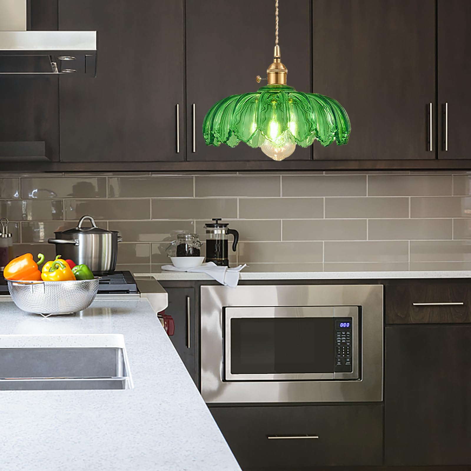 Grass Green Glass Pendant Light Fixtures Medium 9.8 Inches Lampshade Gold Brass Finish