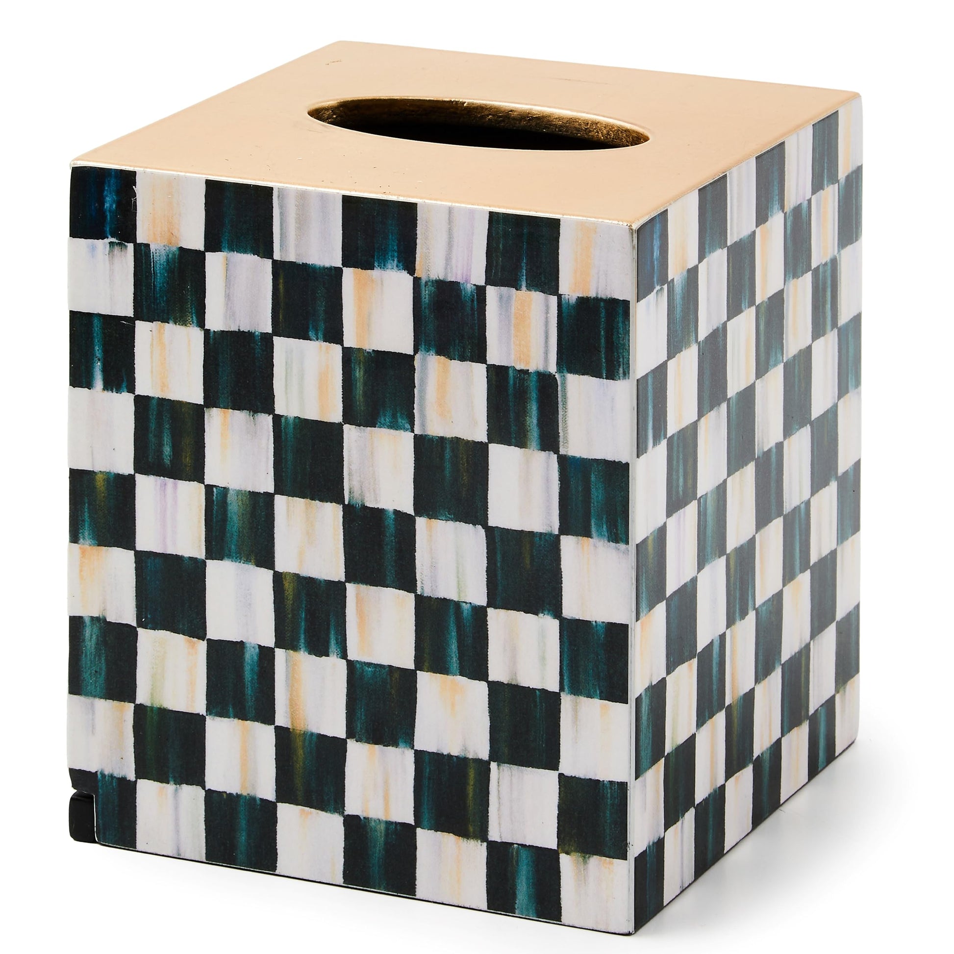 - ELEGANT MODERN ROOM DECOR: Display our beautiful pattern anywhere in your home with this elegant tissue-box cover. The Courtly Check square tissue-box cover features printed black-and-white color-dragged checks layered with lacquer and gold leaf.