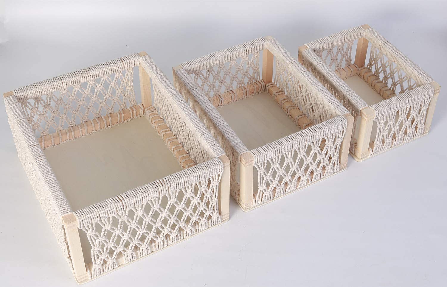 - Macrame Basket set of 3 size:15"L x12"W x 6.5"H(Large),12.5"L x 9.5"W x 6"H(Medium),10"L x 7.5"W x 5.75"H(Small);