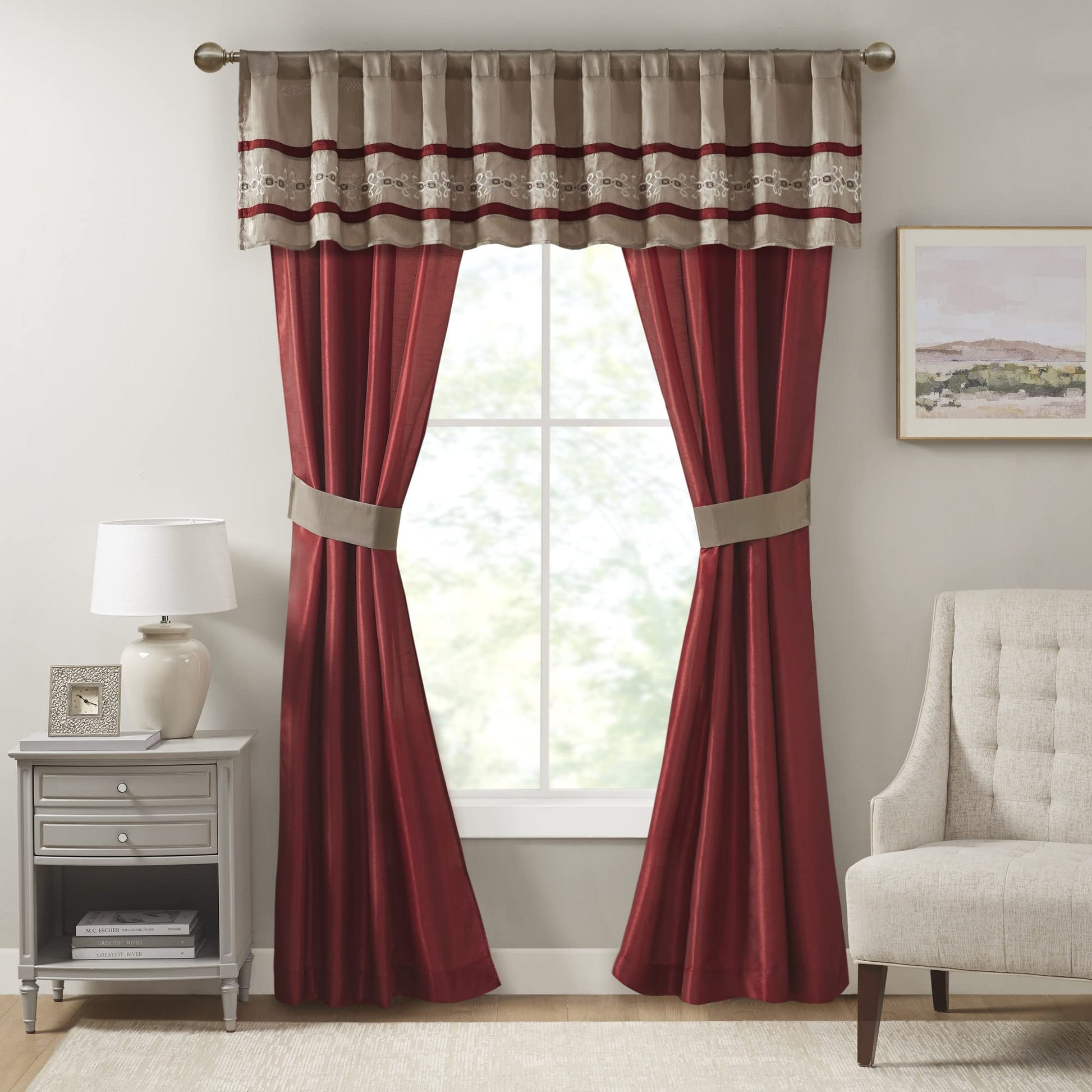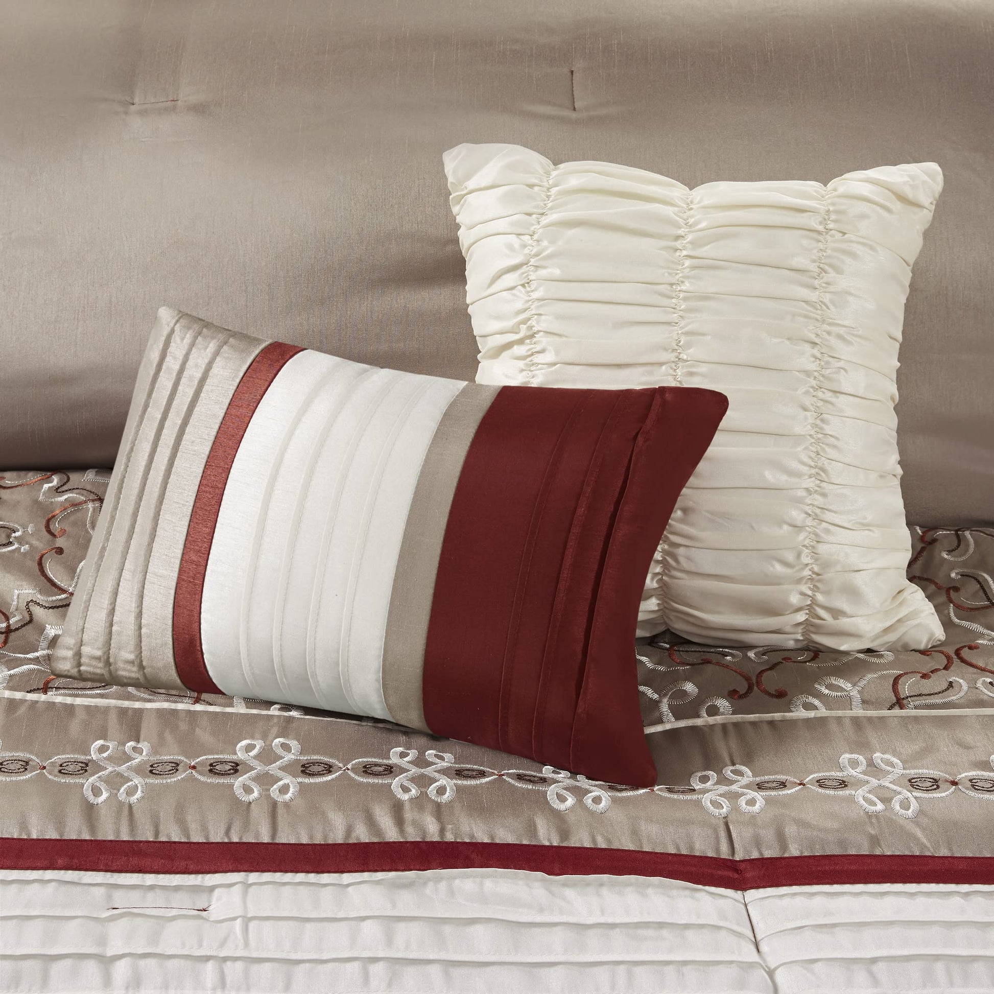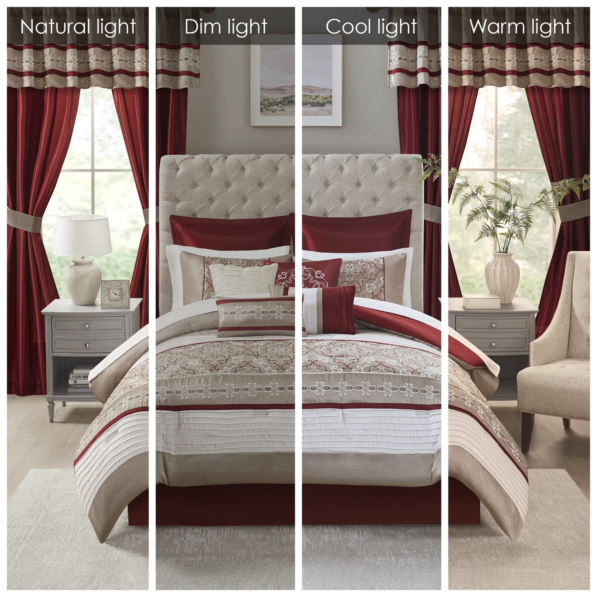 - Set includes: 1 Comforter: 90"W x 90"L, 2 Standard Shams: 20"W x 26"L, 1 Bedskirt: 60"W x 80"L plus 15"D, 4 Decorative Pillows: 16"W x 16"L/12"W x 18"L/18"W x 18"L/12"W x 16"L, 2 Euro Shams: 26"W x 26"L plus 2"D, 1 Flat Sheet: 90"W x 102"L, 1 Fitted Sheet: 60"W x 80"L plus 14"D, 2 Pillowcases: 20"W x 30"L, 4 Window Curtains: 42"W x 84"L, 2 Window Valances: 18"W x 54"L, 4 Tiebacks: 4"W x 23"L