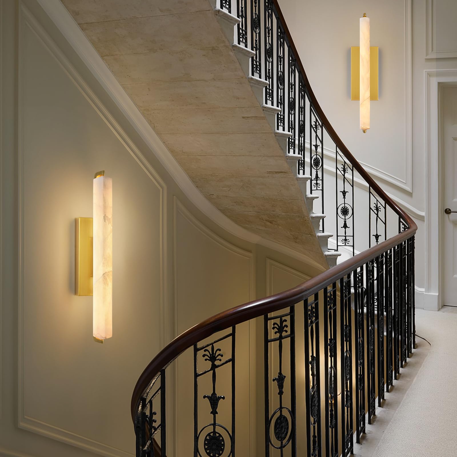 - Elegant alabaster wall sconce each shade is made of natural marble imported from Spain, with a one of a kind beautiful texture, showing the inner beauty of rare natural stone. Hand-picked for you the more expensive & beautiful white snow texture. Morden alabaster sconce add sophistication & luxury to any of your spaces.