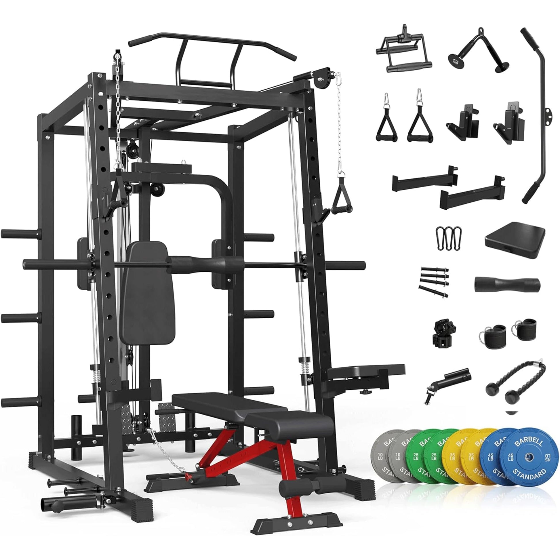 - All-in-One Fitness Marvel] The CS00 smith machine is a powerhouse, combining multiple machines like chest fly, lat pulldown, seated cable row, cable crossover, half rack, bench press, squat, and pull-up station. Comes with a slew of accessories : a pair of cable handles, a lat pulldown bar, a cable bar, a bicep rope and a V-shaped bar