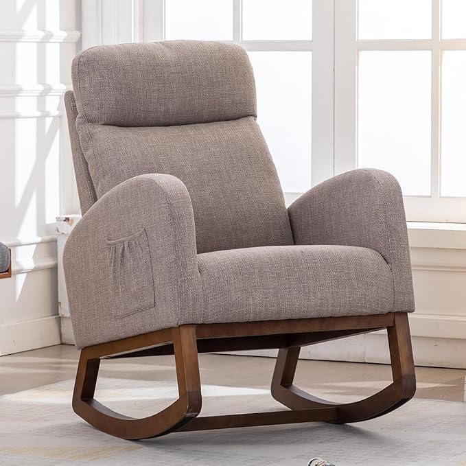 Rocking Chair Nursery, Glider Chair with High Back and Side Pocket, Solid Wood