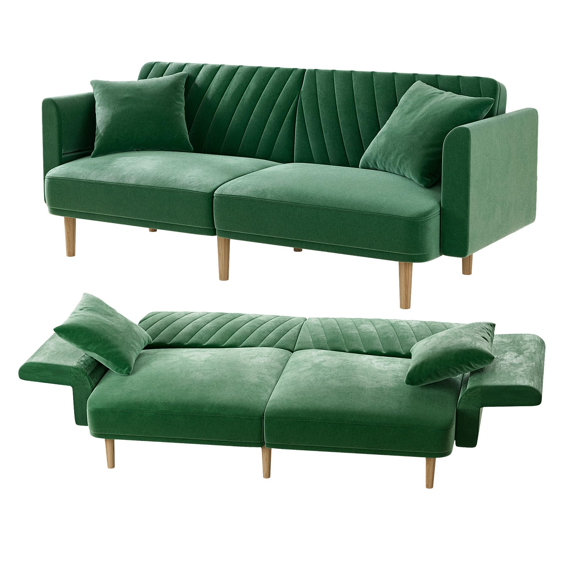 Assembly Required No Product Dimensions 30.3"D x 75.3"W x 27.8"H Type Futon Color Emerald Green Special Feature with 2 Pillows Upholstery Fabric Type Velvet Room Type Living Room Arm Style foldable Pattern Solid