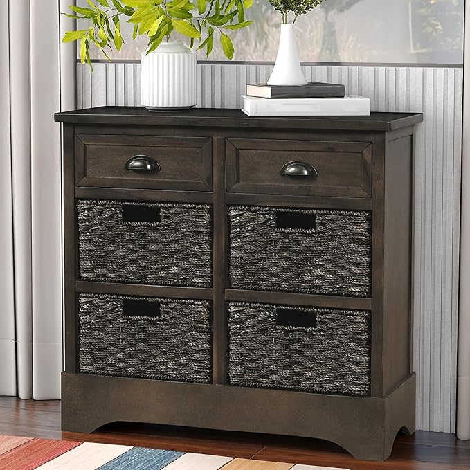 Storage Cabinet Retro Style Storage Unit with 2 Drawers and 4 Baskets for Home Entryway