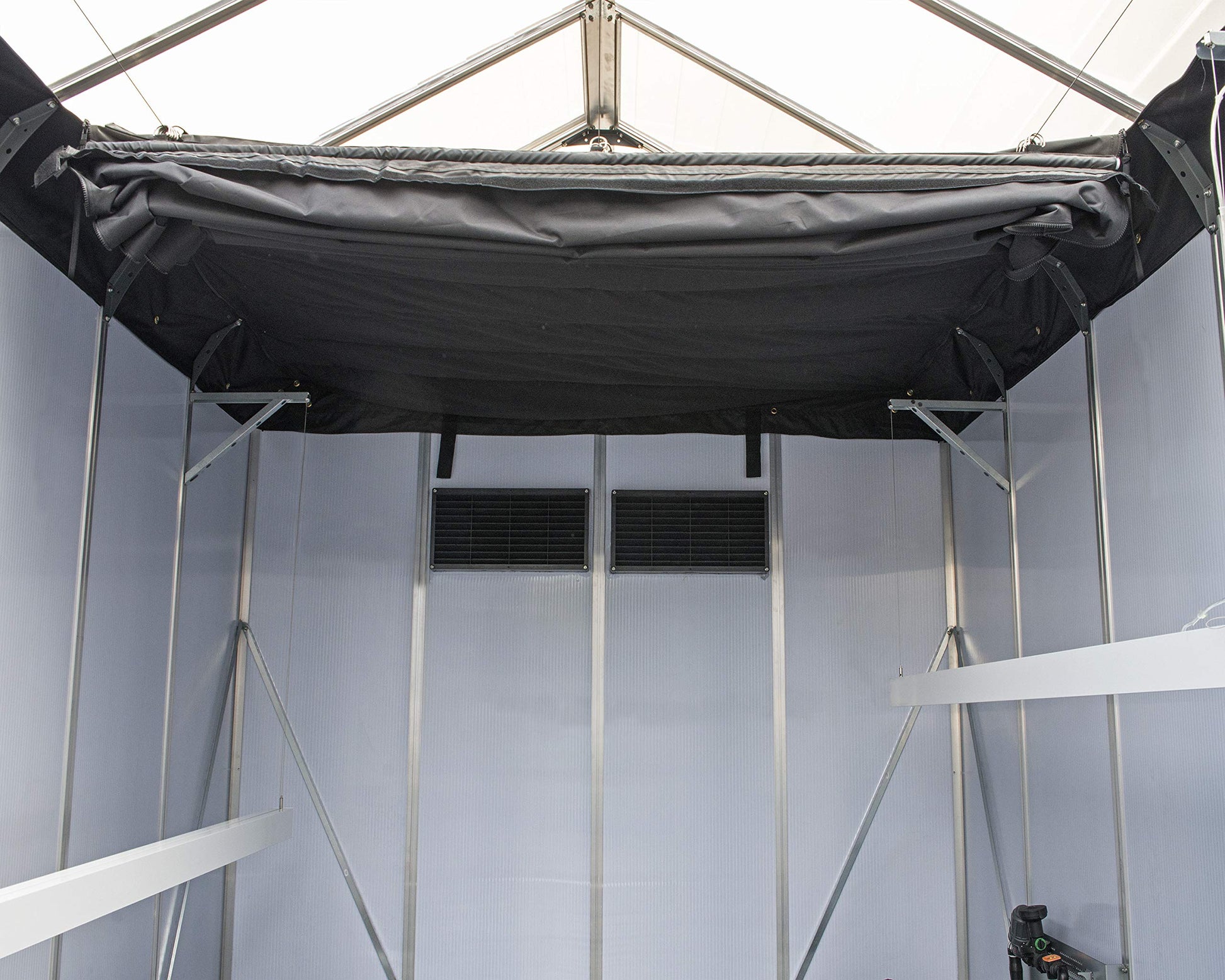 - Effective humidity and ventilation control through six large screened roof vents and four light blocking wall vents