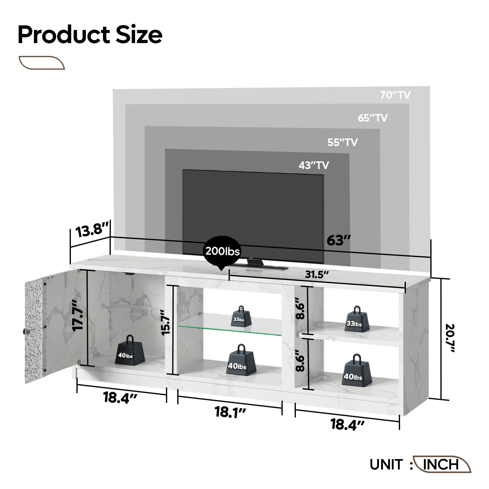 - 【Sleek Modern TV Stand】 Measuring 63" x 13.8" x 20.7", this LED modern TV stand for living room is made from high-quality P2 particle board and tempered glass and can support up to 200 pounds. Perfect for displaying your TV and decor items stylishly. The included anti-tip kit provides additional protection for children. It’s ideal for movie nights or binge-watching sessions.