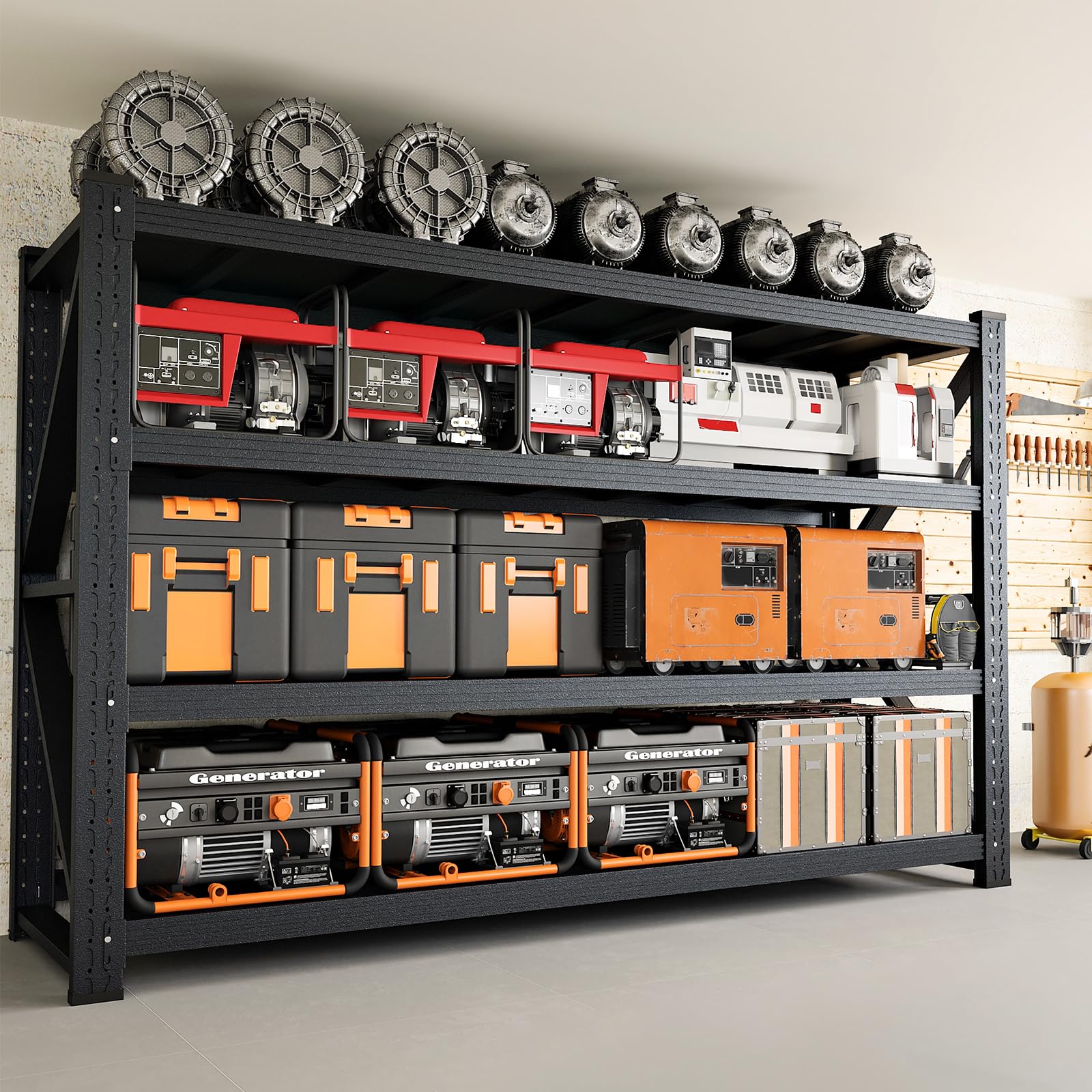 - Our Super Heavy-Duty Garage Shelving Unit features adjustable shelves that can be easily moved to accommodate items of different sizes. The locking pins also add an extra layer of security, preventing accidental disassembly and ensuring that your items remain safely stored. This user-friendly design makes our heavy-duty shelving unit a practical and convenient solution for a wide range of storage applications