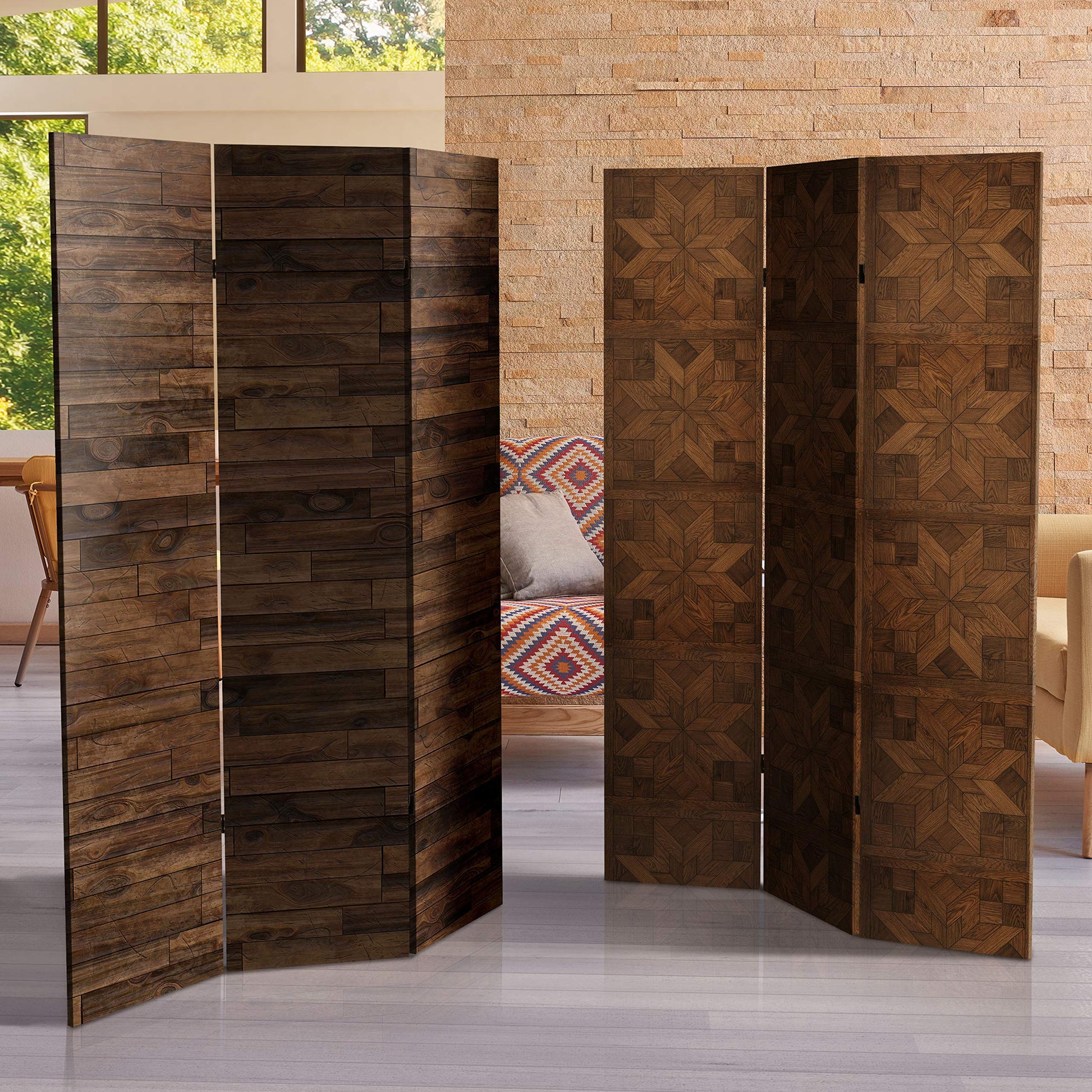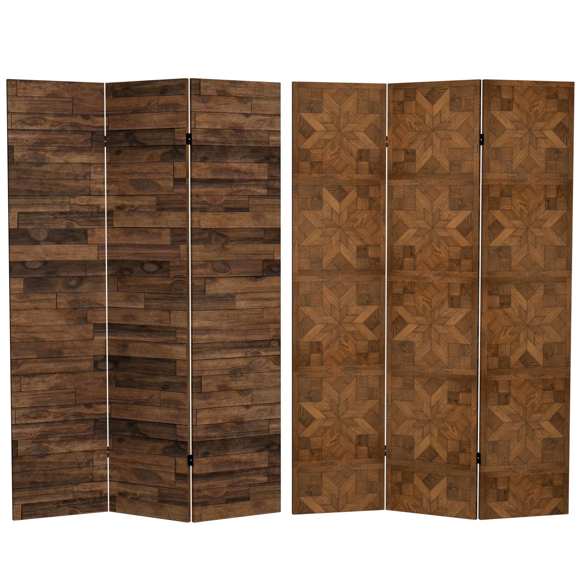 Details: Hardwood flooring is desirable not only for its strength and durability, but also for its beauty. This room divider features two high resolution prints of this popular architectural feature. A traditional pattern on one side and anornate parquet pattern on the other highlight the true beauty of hardwood flooring. The rich walnut hue makes this room divider a versatile decorative accent.