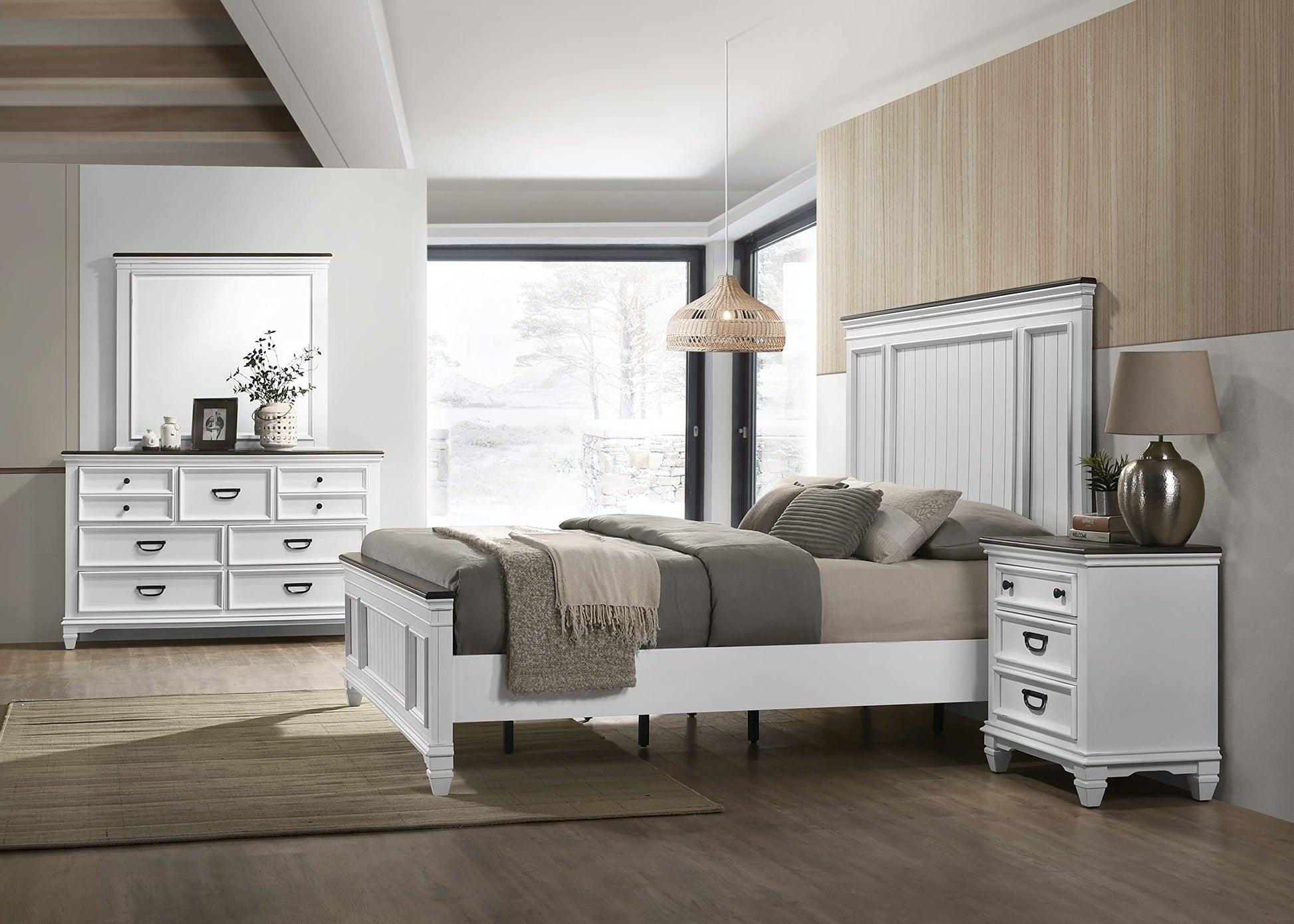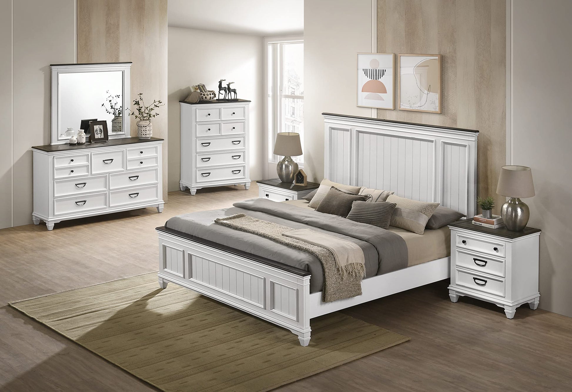 - The set includes queen bed, dresser, mirror, two nightstands, and chest. Classic lines and shiplap panel details on the bed. The distressed mark and delicate carved trim bring a touch of modern farmhouse style to this set. The bed includes headboard, footboard, rails, and 4 slats