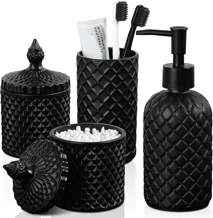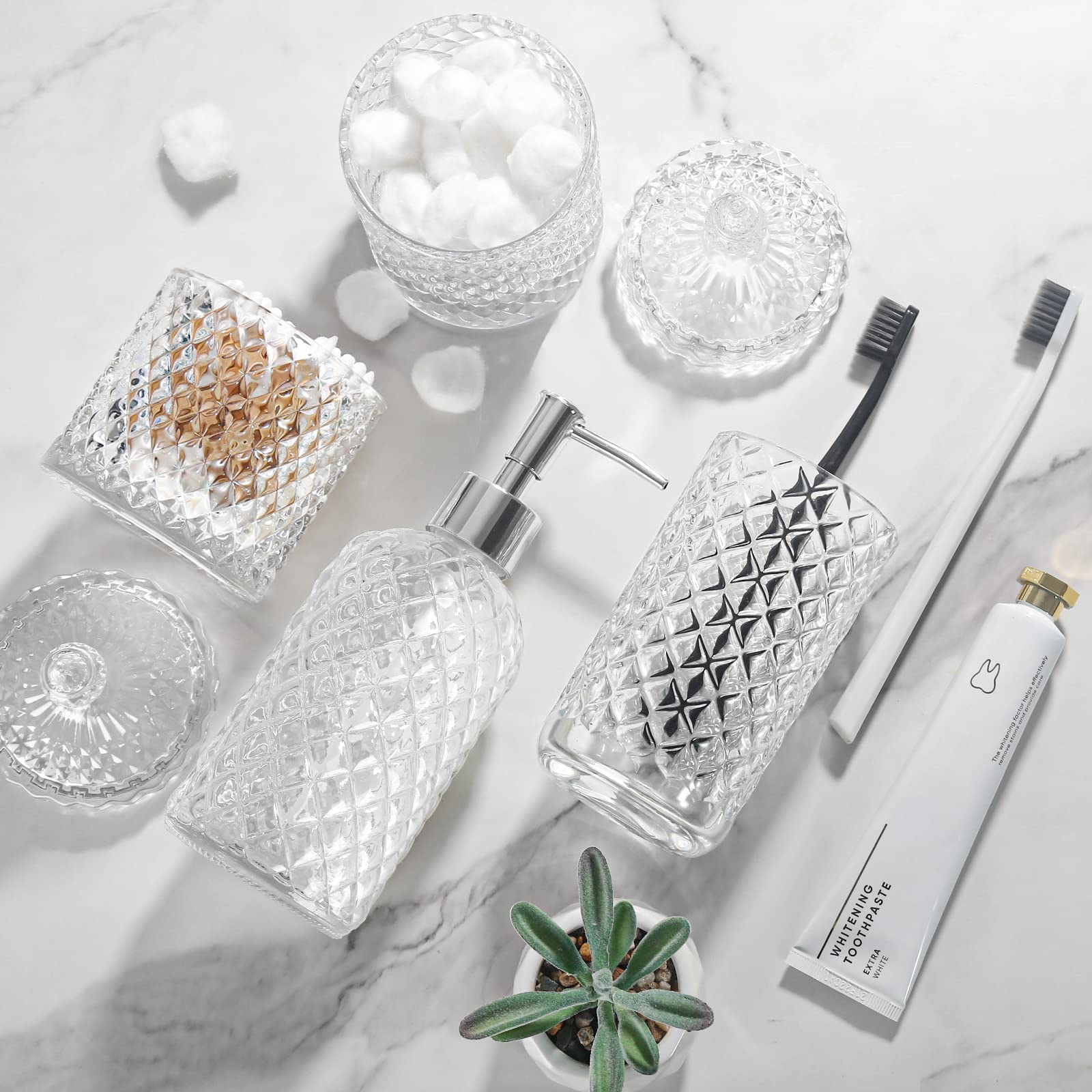 - Get these DIAMOND STYLE elegant additions to your bathroom right now! Let these bathroom accessory set brighten your bathroom nicely! This bathroom soap dispenser set is perfect for every bathroom theme no matter boho, modern, farmhouse, vintage, and western, you name it! You would get a SOAP DISPENSER, a TOOTHBRUSH HOLDER, a QTIP HOLDER, and a COTTON BALL HOLDER in just ONE set!Diamond is a symbol of purity and magnificence. Such a diamond-style glass bathroom accessories set could be easily suitable for your bathroom themes. Brighten up your bathroom space in a way that’s as unique as you are. Each bathroom set accessories is handcrafted by experts, and each diamond pattern on it is equally sparkling, not only in your bathroom but also in the eyes of every guest who enjoys it.