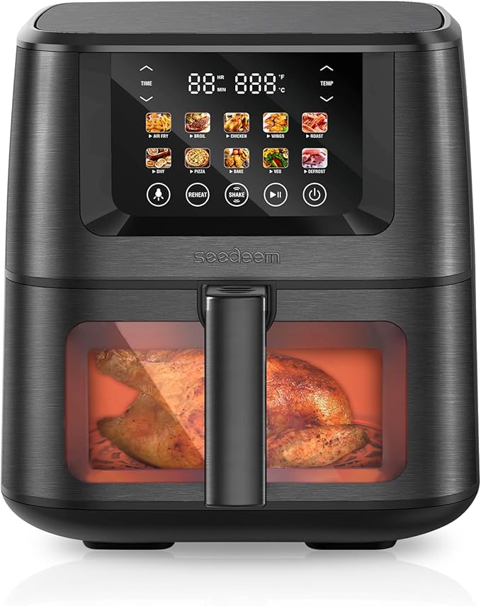 - The SEEDEEM Air Fryer is equipped with a large color screen, displaying the operational interface and cooking status intuitively and clearly, offering you a more convenient control experience. The full touch design simplifies operation; with a gentle touch on the screen, you can easily select and adjust various functions, making the cooking process more straightforward. Making your cooking experience easier.